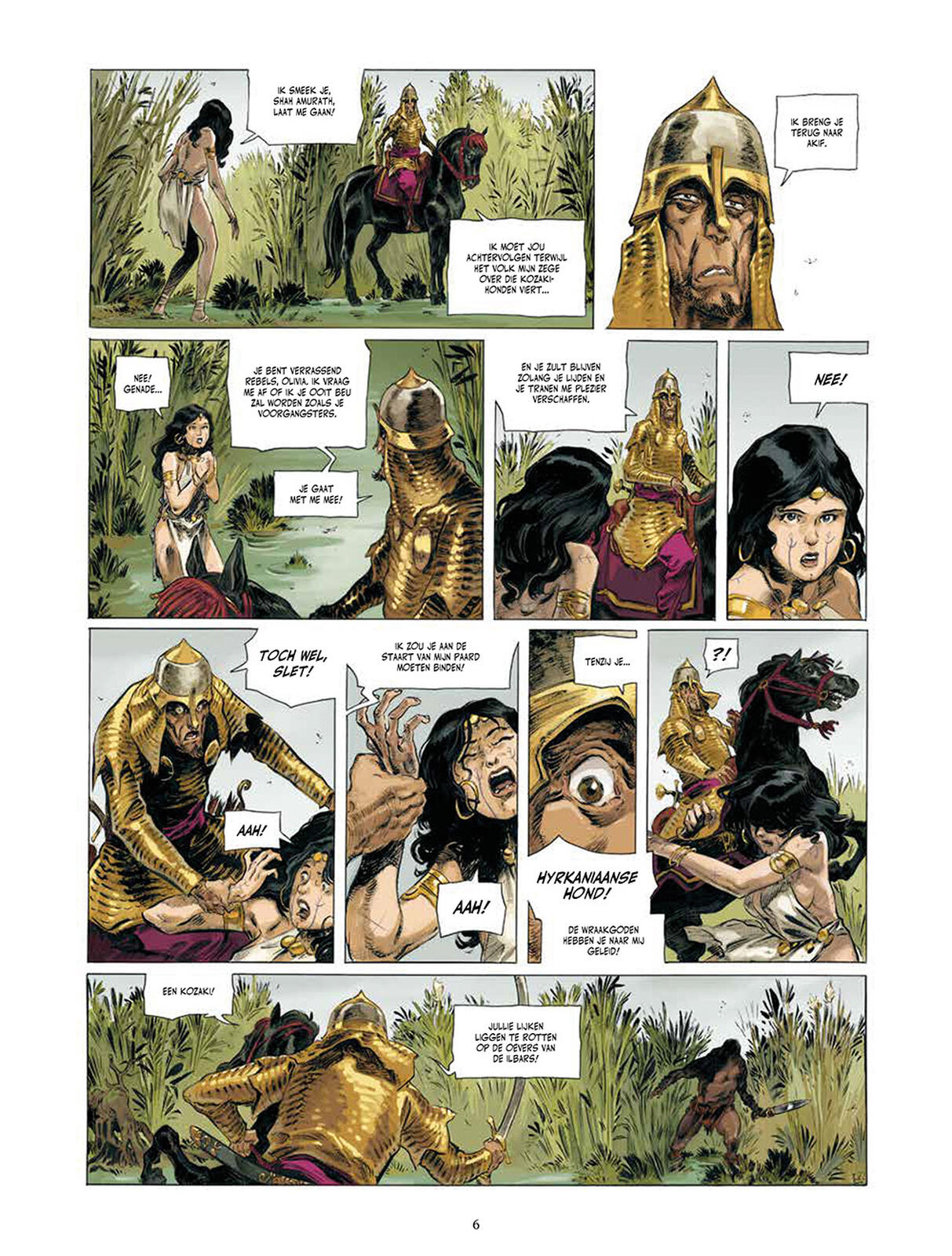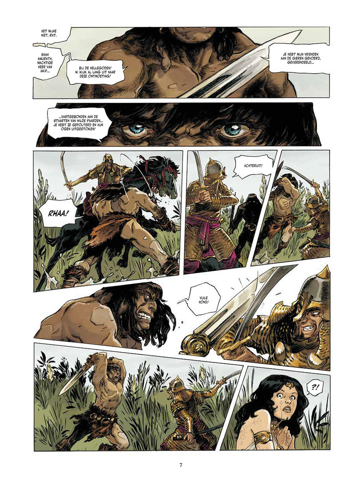 Virginie Augustin is gepokt en gemazeld in het fantasygenre (Alim de Leerlooier, Legenden van Troy). Ze is dan ook geen verrassende naam én een publiekstrekker om een van de oorspronkelijke novelles te verstrippen van Conan, een stamvader van de pulpfantasy. Die Conan-verhalen hebben vaak niet veel om het lijf. Het gaat om bruut geweld tegen monsters, legers, grote krachten en machten en liefst met dames in nood om de held van dienst een aanleiding te geven om zijn gat op te heffen en ten strijde te trekken. Maar het is (h)eerlijke (horror)pulp die prima en ongegeneerd entertainment, leesvoer en op stripgebied tof kijkvoer oplevert. De Conan-verhalen schreeuwen nu eenmaal om een visuele bewerking.