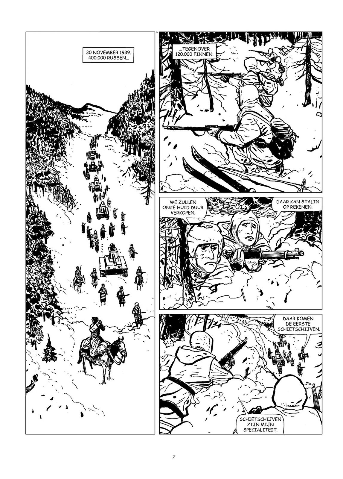Ritstier en de Heij brengen het verhaal van Simo Häyhä op een zeer sobere manier, net zoals de man zelf was. Simo was geen grootroeper die zichzelf verheerlijkte met de Russische scalps die hij op zijn conto mocht schrijven. De man was de eenvoud zelve, die eenvoudig zijn plicht deed. Dat hij daarvoor als scherpschutter honderden Russen moest neerschieten, was voor hem gewoon de opdracht die hij kreeg van zijn oversten. Voor de Finnen mag de man dan een grote held zijn, Häyhä bleef gewoon zichzelf, de jager die in plaats van urenlang in de sneeuw te liggen om een rendier neer te schieten, nu in diezelfde sneeuw lag te wachten tot er Russische soldaten voor zijn vizier verschenen.