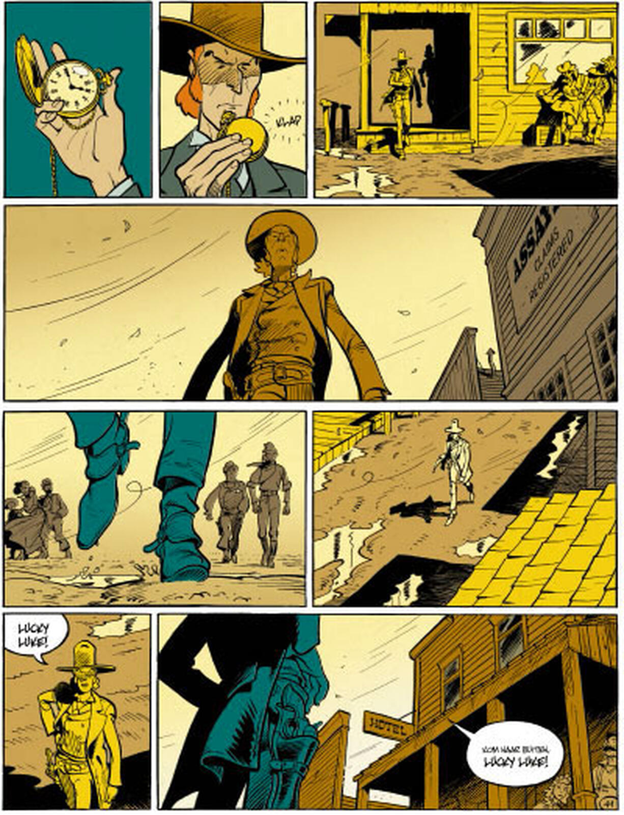 "Kikvors- en vogelperspectief op een uiterst geconcentreerde Lucky Luke. En dan prent 3... Vervolgens is er nog een spelletje om Luke tevoorschijn te laten komen zonder hem echt te laten zien. De sfeer wordt bepaald door het piepen van de deur en het gekraai van de gier op het bord van de doodgraver. Ook in de laatste prent dienen de kleuren om de voor- en achtergrond van elkaar te scheiden. Ik had graag zoveel mogelijk toeschouwers van het vuurgevecht willen tekenen, maar dan liep ik het risico dat het oog van de lezer zou afdwalen."