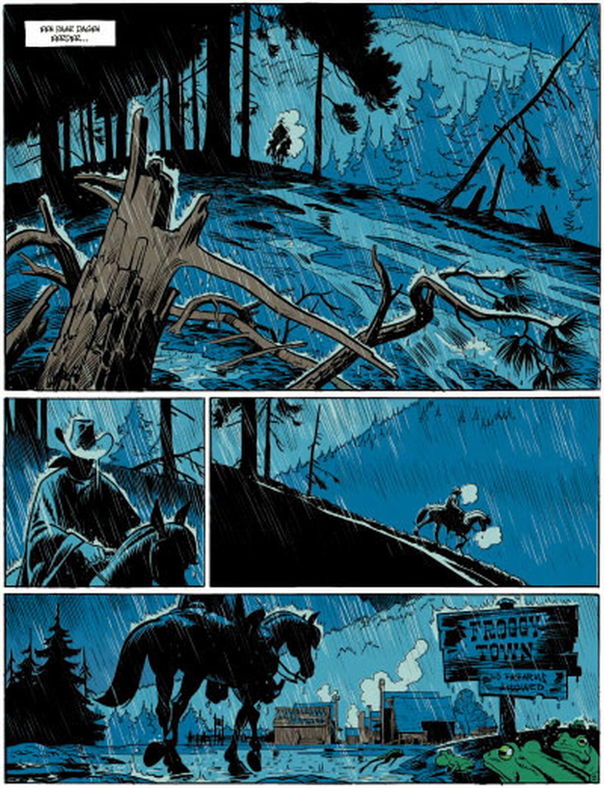 "Je opent het album, PANG, vogels vliegen op... Mijn stadje. Ze telt een vijftigtal inwoners, maar er zijn er nog een hoop anderen op hun onooglijke concessies aan de rivier waar goud te vinden is. Ik heb deze pagina getekend na de vierenveertigste. Ga daar snel kijken, dan begrijp je waarom. Het was bijzonder traumatiserend om een dode Lucky Luke in de modder te tekenen nadat ik een veertigtal pagina's met hem had doorgebracht."