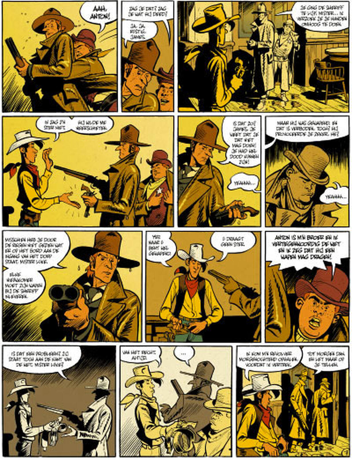 "Ik wilde het oog van de lezer leiden naar de beweging van de Colt. Anton trekt snel, zelfs goed. In prent 3 verwoest de vader de legende van de man die sneller schiet dan zijn schaduw. Maar hij vergeet te zeggen dat zijn slagen het zicht van zijn zoon hebben verstoord. Zodra Laura in beeld komt, wordt alles roze en paars. Omdat het semi-realistisch is, gebruik ik enkele kleurverlopen die niet bij Morris voorkwamen. Hier dient een beetje mist om de voor- en achtergrond te onderscheiden."