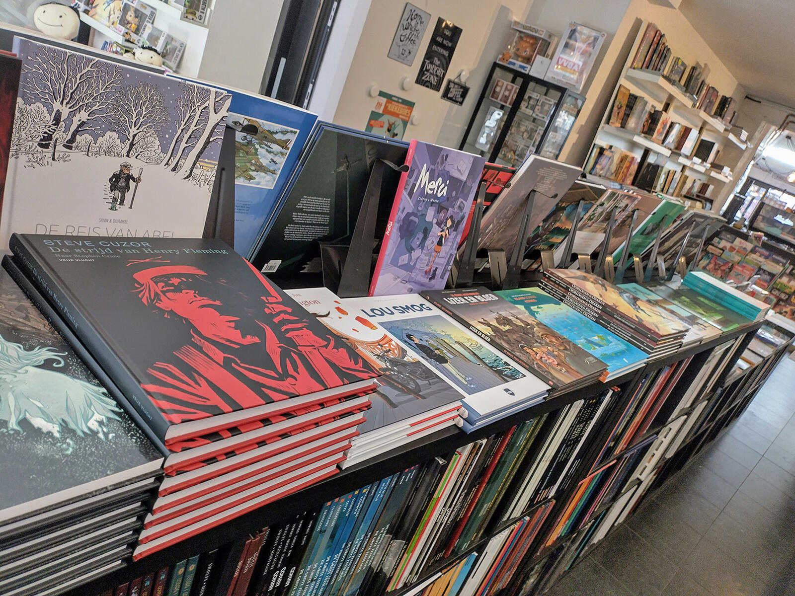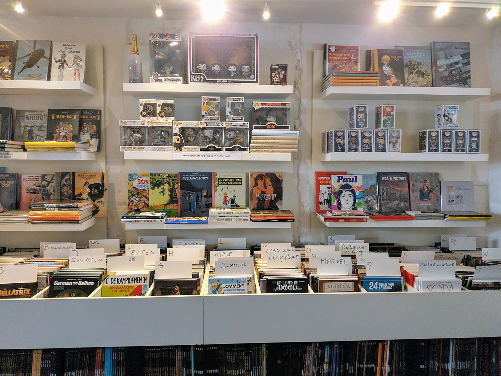 "Ook hebben we van in het begin een ruime collectie Funko-poppen in ons aanbod. De vraag hangt wel af van de films en televisieseries die op dat moment populair zijn. Voor onze stripalbums ligt de focus op Europese strips. Dat heeft uiteraard te maken met de ruimte die we beschikbaar hebben. Vooral fantasy en historische strips van verschillende uitgeverijen worden hier goed gekocht. Ook graphic novels vinden hier gemakkelijk een koper. Strips die je ook in krantenwinkels vindt, zijn hier minder populair. Manga — wat in stripspeciaalzaken in grotere steden goed verkoopt — slaan hier niet echt aan."