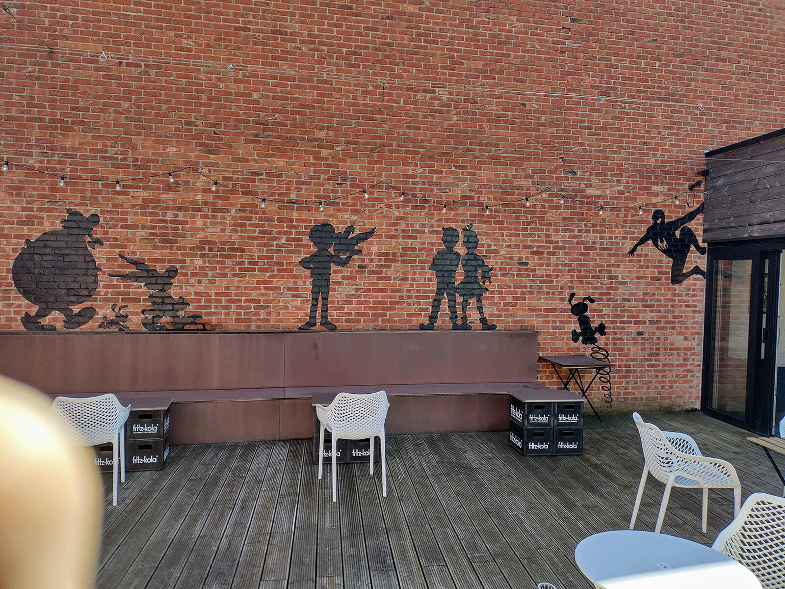 "We waren al heel trots op de strippanelen, getekend door Joey Potargent, die buiten aan onze gevel hangen. Een nieuwigheid aan de inkom én binnen zijn de vier strippanelen van Michaël Olbrechts. Die stonden tentoongesteld in het Jenevermuseum in Hasselt. We hebben ze gekregen van de directeur van het museum, die niet alleen een goede vriend van ons is, maar ook een goede klant. Deze borden zijn echter niet te koop."