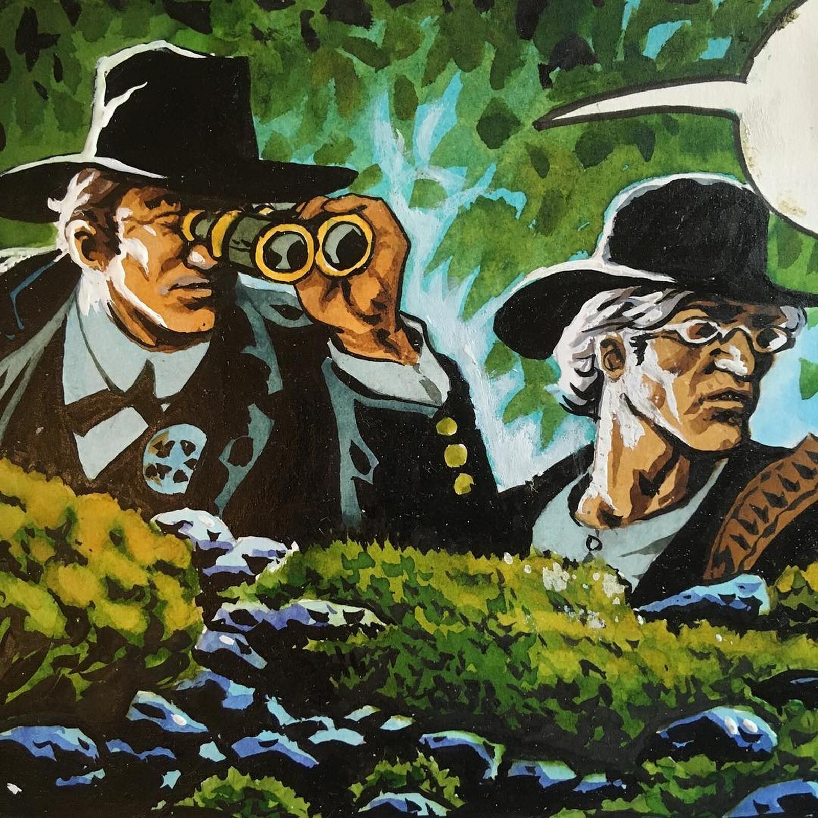 Hieronder vind je fragmenten in potlood en uitgewerkt in kleur met een paar foto's van zijn proefpagina's.