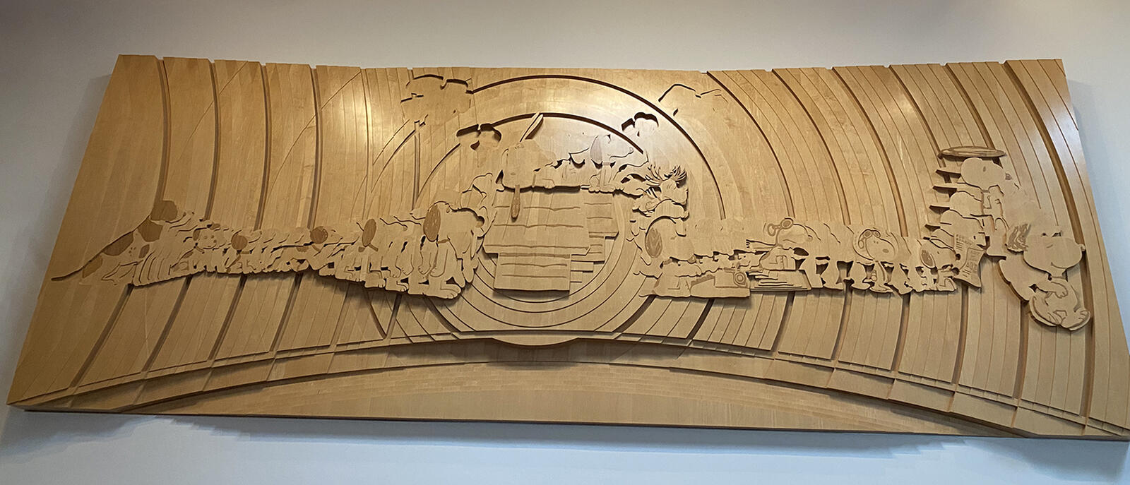 Een tweede imposante creatie gebaseerd op meer van Yoshiteru’s werk is de Morphing Snoopy. Hij maakte een driedimensionele decoupage uit papier, waarmee hij de evolutie toont die Snoopy grafisch doorloopt van zijn eerste verschijning in 1950 tot zijn best gekende vorm uit de jaren 1990. Voor het museum werd dat werk vertaalt naar een meer dan drie ton wegende houten sculptuur, opgebouwd uit driënveertig fineerlagen van esdoornhout. Groot. Indrukwekkend. Vergeet niet om je mond weer dicht te doen voordat je een vlieg binnenkrijgt.