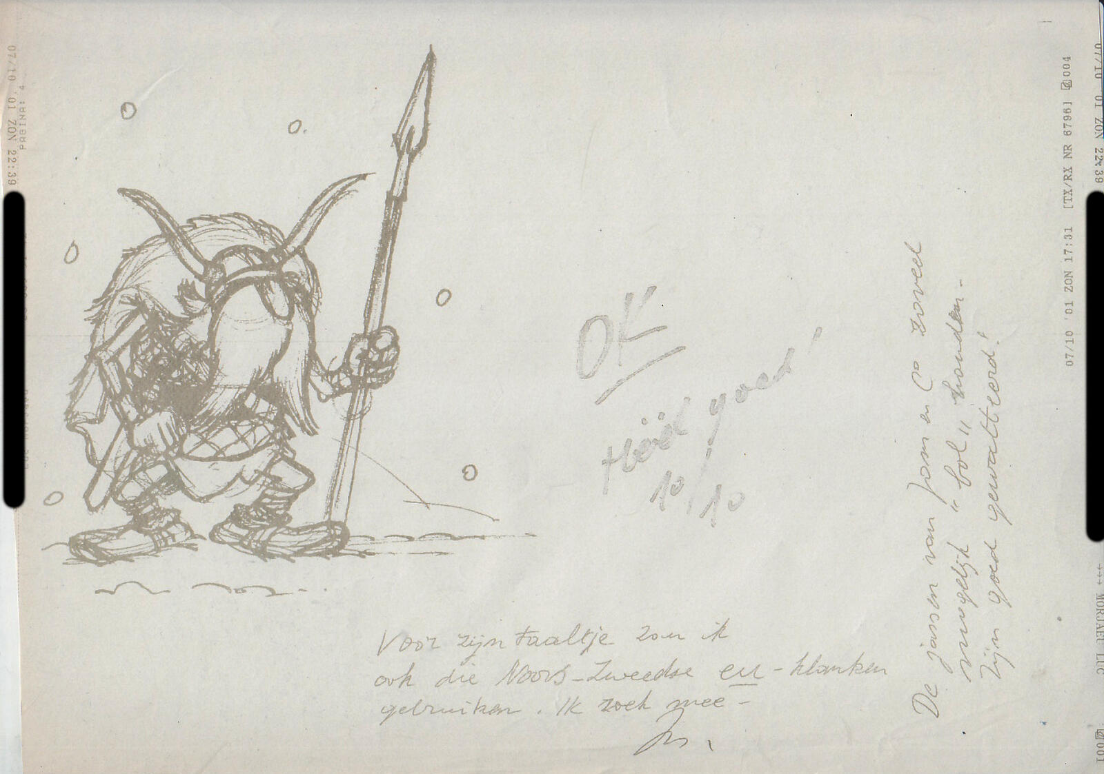 Een fax van Jef Nys met een 10/10 voor Luc Morjaeu voor zijn werk aan De Laatste Viking (deel 216). Daaronder de prehistorische Huaargh-stam, een knipoog naar Jef Nys.