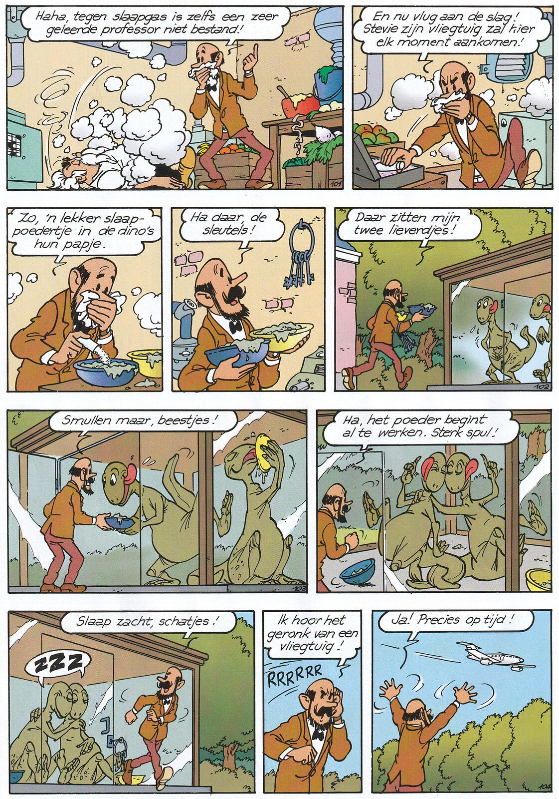 Morjaeu: “Dat was Het Heksenbal (deel 168). In 1991 moet dat geweest zijn. Met MORMIC heb ik toen van een twaalftal opeenvolgende albums de decors getekend. Een daarvan was De Snoezige Dino’s (deel 176). Patrick Van Lierde was eraan begonnen, maar door omstandigheden moest dit album volledig hertekend worden. Ik herinner me nog de kooien waarin de dino’s opgesloten zaten. Deze bestonden eerst uit traliewerk, maar ik heb er doorzichtige kooien in glas van gemaakt omdat dit visueel veel aantrekkelijker en interessanter was. Vanaf Filicasso (deel 180) tekende vooral Dirk Michiels de decors omdat ik op dat moment heel wat tekenwerk had voor studio MORMIC, onder andere voor De Familie Backeljau en ook veel reclamewerk en werk voor Studio 100. Ik schat dat ik in die periode maar aan een vijftal albums heb meegewerkt. Vanaf De Elfenbron (deel 196) kon ik me opnieuw toeleggen op het tekenen van decors voor Jommeke omdat ik toen niet meer voor MORMIC werkte (Morjaeu verliet MORMIC in 1997, nvdr). Vanaf 1997 schreef en tekende ik ook al volledige korte verhalen.”