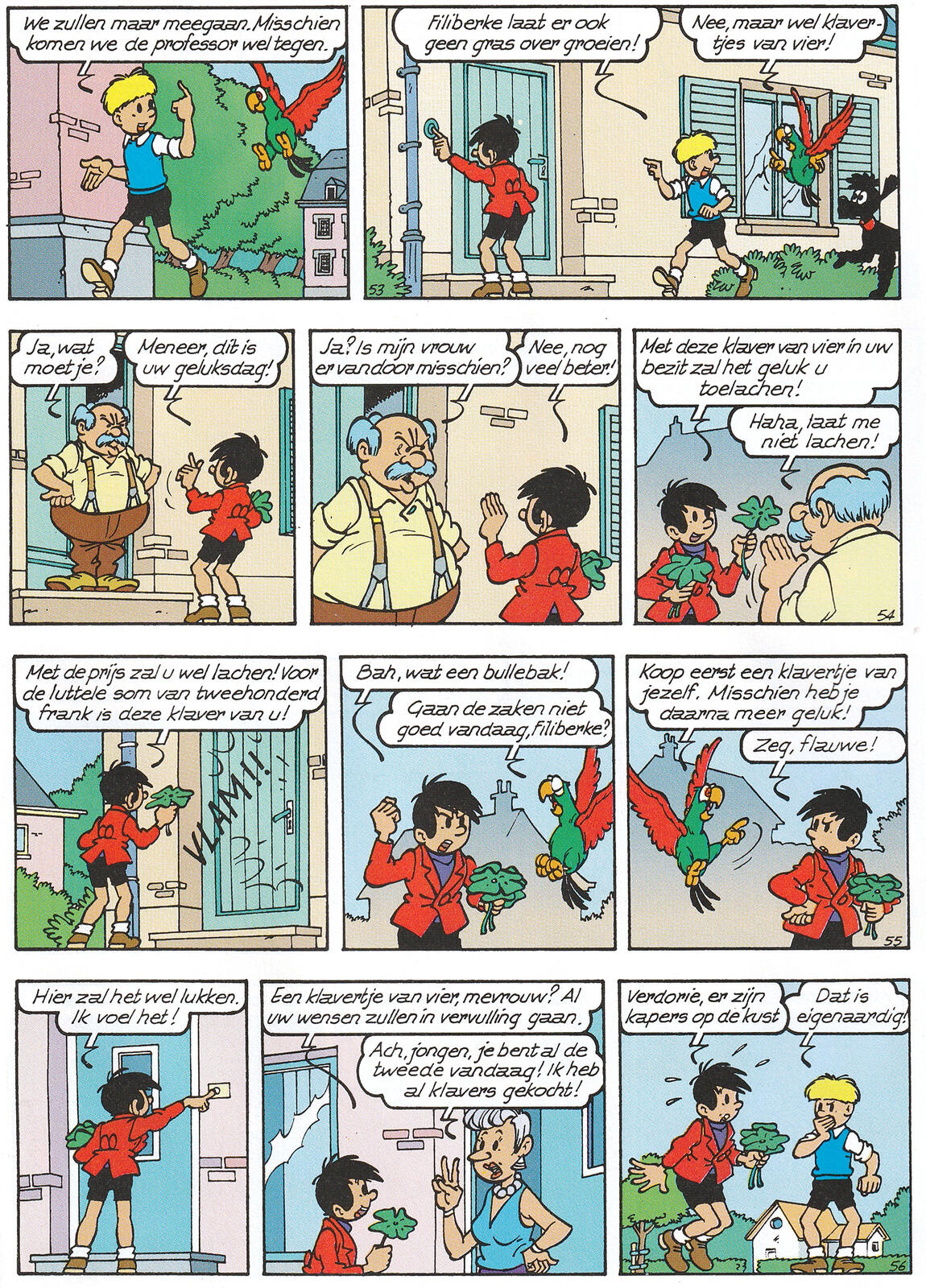 Het korte verhaal Klavertje van Vier (1995) is een van mijn favoriete korte verhalen van Jommeke. Vooral die ene strook waarin Filiberke bij een norse man aanbelt om te zeggen dat het zijn geluksdag is waarop de man repliceert "Ja? Is mijn vrouw er vandoor misschien?" en Filiberke enthousiast antwoordt: "Nee, nog veel beter", is wat mij betreft een van de grappigste dialogen uit de stripreeks. Deze gewaagde humor, vermoedelijk een subtiele grap bestemd voor de mee- of voorlezende ouders, is toch wel atypisch voor een verhaal van Jommeke, vind je niet?