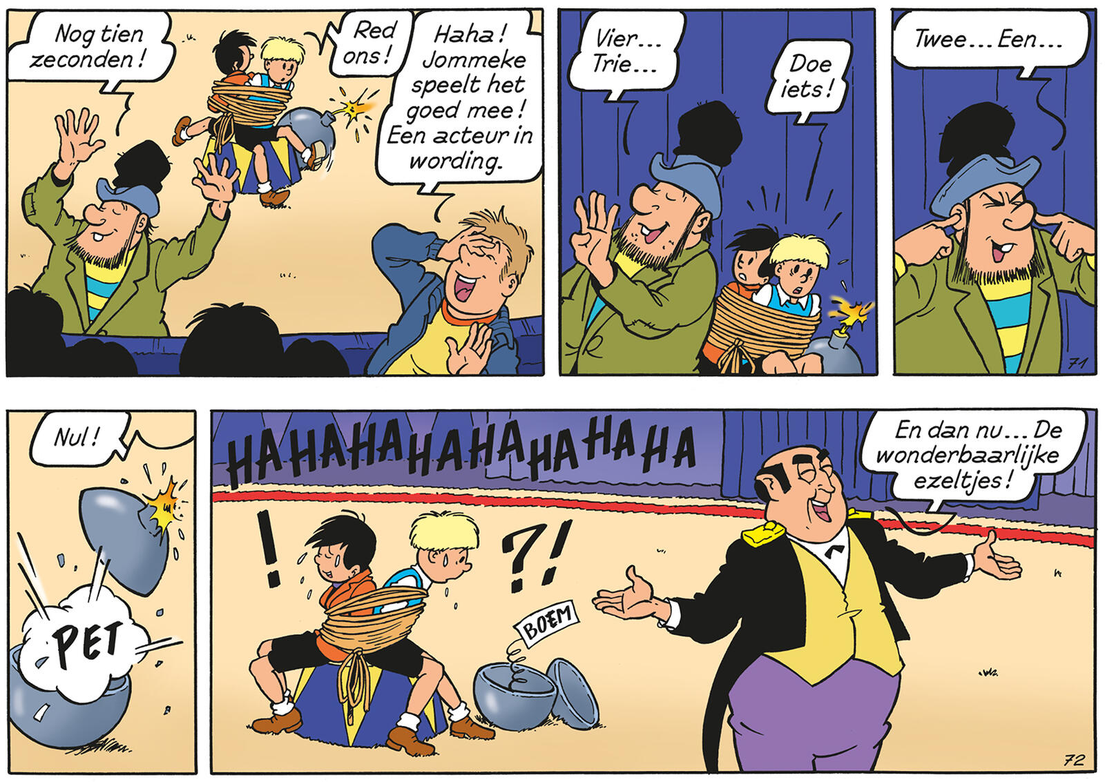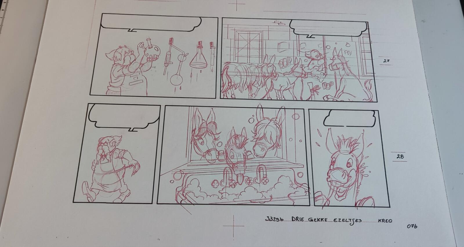 Fagard: “Correct. Tot op heden had ik enkel met Phillipe contact. Voordat ik met Jommeke startte, heb ik Dieter ook wel al eens kort ontmoet, maar ik heb tot nu toe nog niet met hem kunnen samenwerken. Een heel leuk moment voor mezelf was toen ik bij Philippe thuis was om even de al getekende platen door te nemen. Dat was net na een evenement rondom Jommeke in Technopolis, waar hij via een verzamelaar een tekening van Jef Nys zelf had kunnen bemachtigen. De fierheid waarmee hij dat liet zien en de mooie herinnering aan Nys die hij toen deelde, zullen me nog heel lang bijblijven. Dat zijn kleine momenten waarbij je merkt hoeveel plezier hij nog steeds heeft om de verhalen voor Jommeke te maken. Een ander geslaagd moment voor mij was toen hij mijn interpretatie zag van de dansende ezeltjes in Drie Gekke Ezeltjes. Die reactie was puur en hij was heel enthousiast over de houdingen. Zodanig enthousiast zelfs dat hij me prompt in de ochtend een voorbeeld van de inkting doorstuurde die hij op mijn potloodlijn had aangebracht. Dat was een fijne werkdag!”