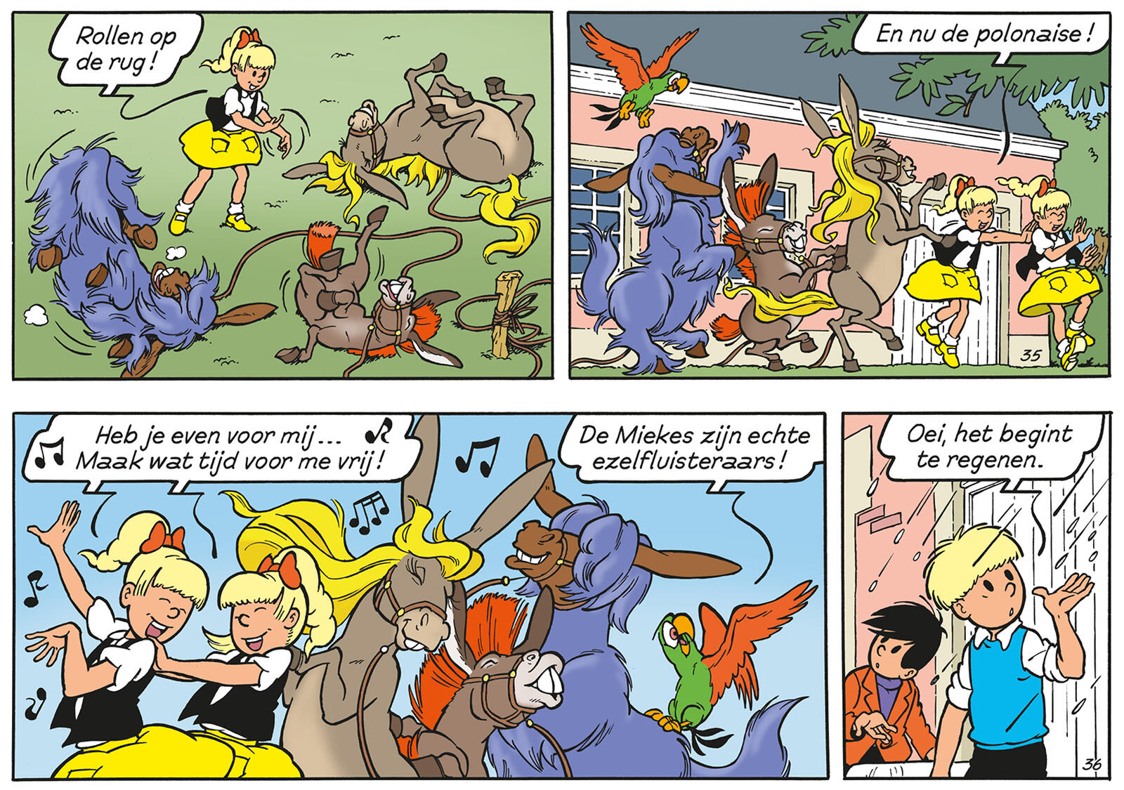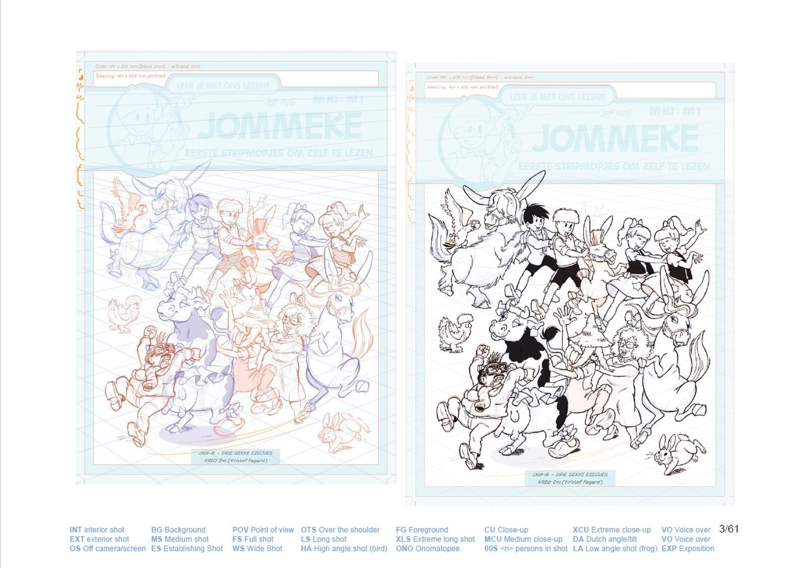 Fagard: “Ik ben niet een persoon die zich focust op wat hij niet graag tekent. Ik hou gewoon van tekenen en dan voornamelijk van dieren, maar dat had ik misschien beter niet laten vallen toen ze een kort verhaal kozen. (lacht) Toch heb ik me enorm geamuseerd met de dieren in Over Koetjes en Ezels. Filiberke en de Miekes teken ik ook heel graag. Jommeke ligt voorlopig nog wat moeilijker. Als ik zijn speciale kapsel teken, moet ik nog steeds goed nadenken over de vorm en het volume. De rest vloeit gelukkig al wat vlotter uit mijn pen.”