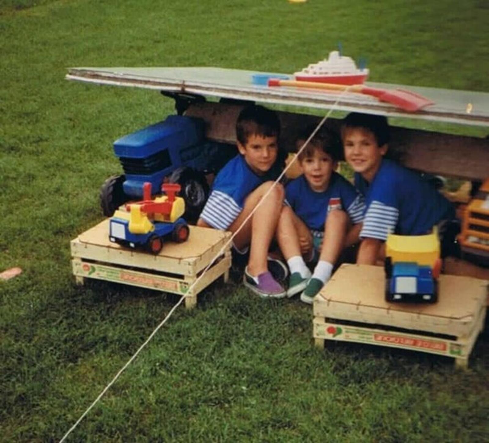 Fragment uit De Kaart van Wawa Wang (deel 98) en een jeugdfoto van de latere tekenaar Kristof (rechts op de foto) met twee van zijn broers in hun vliegende doos.