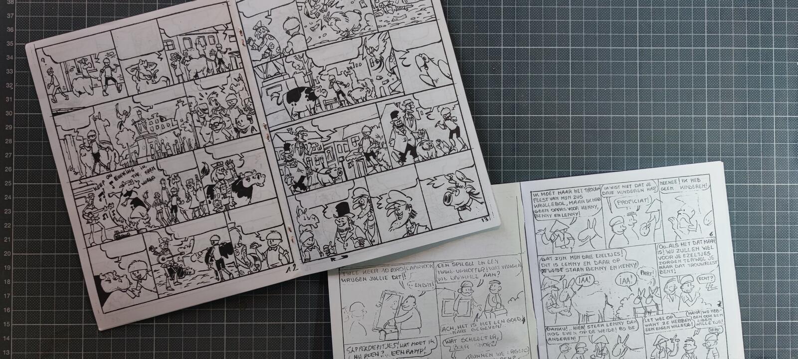 Fagard: “Voor beide korte verhalen ontving ik van de uitgeverij inderdaad het storyboard en een uitgetypt scenario. Iets wat ik voor mijzelf altijd doe wanneer ik een storyboard krijg, is die pagina’s als een boekje afdrukken. Met die boekjes naast mij start ik dan met het decouperen van het album in thumbs, ook wel quarto’s genoemd. Dit helpt me heel goed bij het bepalen van de ‘flow’ en het leesritme.”