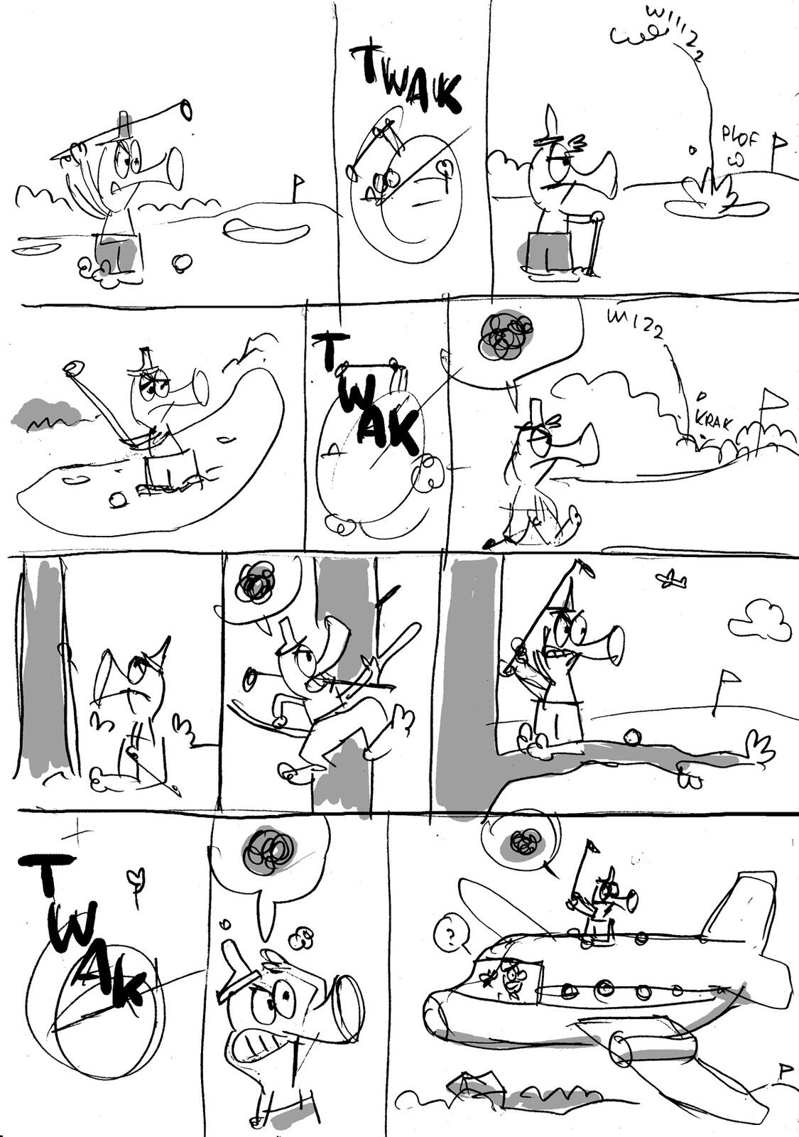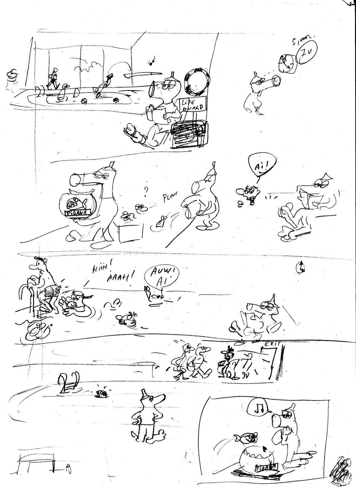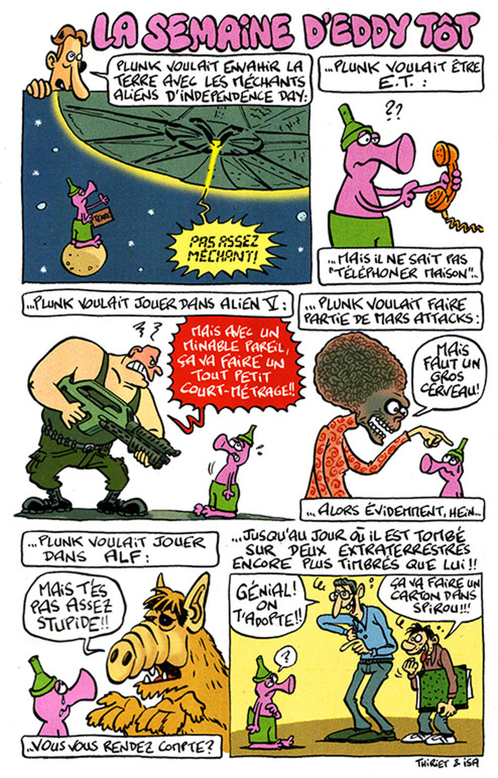 LUC: “Wij dus naar Charleroi met enkele voorstellen. Onze storyboards met Plunk bleken perfect te zijn wat zij zochten. We publiceerden onmiddellijk paginagags. In tegenstelling tot in Taco Zip zei Plunk deze keer geen stom woord.”