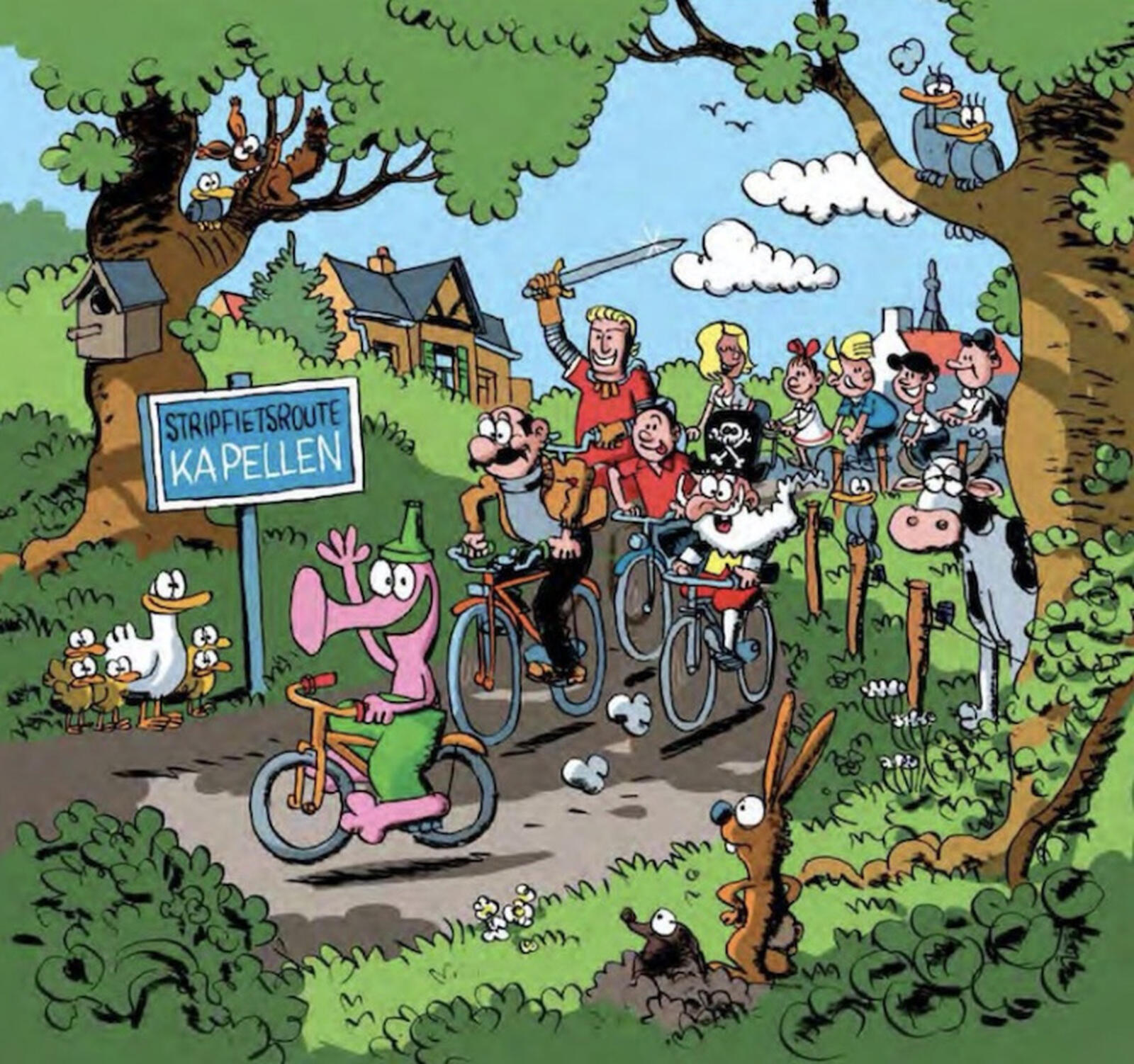 LUC: “Dat is opgenomen in de Striproute, een belevingsfietstocht door verschillende Antwerpse randgemeentes. Het is gemaakt door Joris Peeters, een Limburgse beeldhouwer. In mijn ontwerp had ik een sensor toegevoegd zodat mensen die dichtbij kwamen kijken nat gesproeid zouden worden. Maar het leggen van de waterleidingen bleek buiten het budget te vallen. (lacht) Ik heb ook een stripmuur met Plunk geschilderd op het seinhuisje aan de Korte Franselei. Daarvoor heb ik me laten inspireren door het werk van M. C. Escher.”