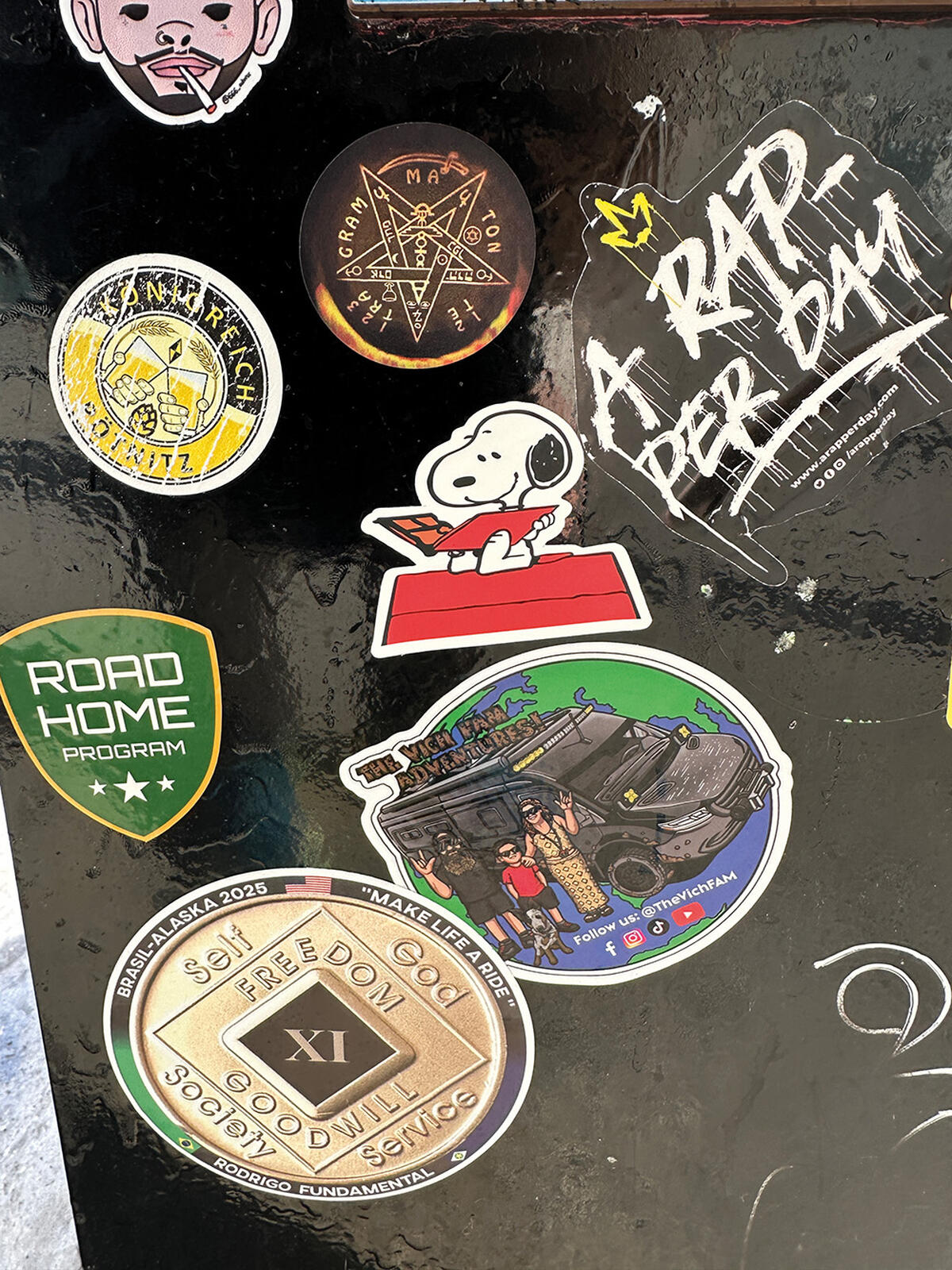 “Get your kicks on Route 66.” Ik heb geen van de bijna vierduizend kilometer lange autosnelweg afgelegd, maar de start van de legendarische weg ligt wel in Chicago. Op de achterkant van een van de plakkaten hangen twee Snoopy's tussen de vele stickers.