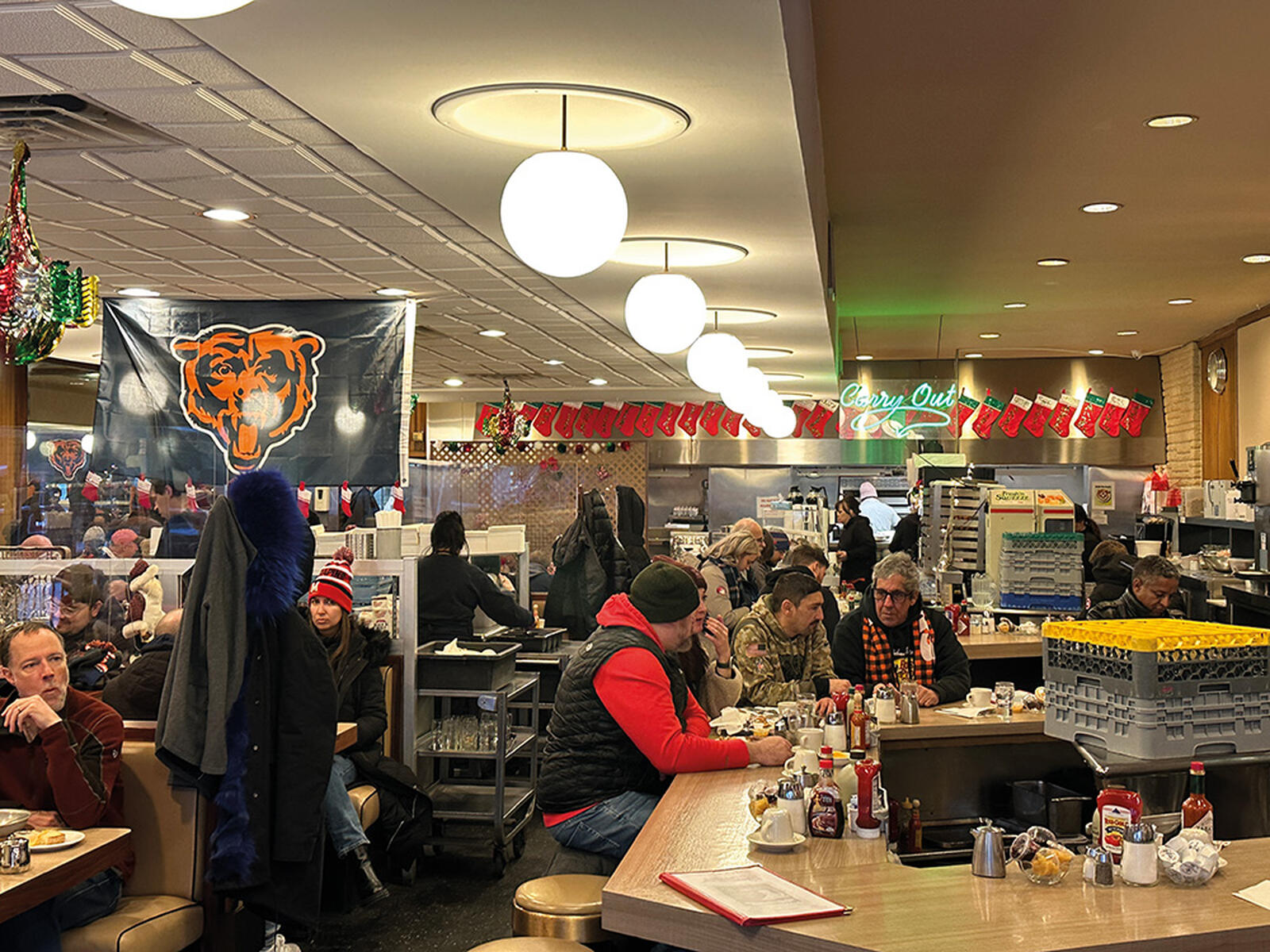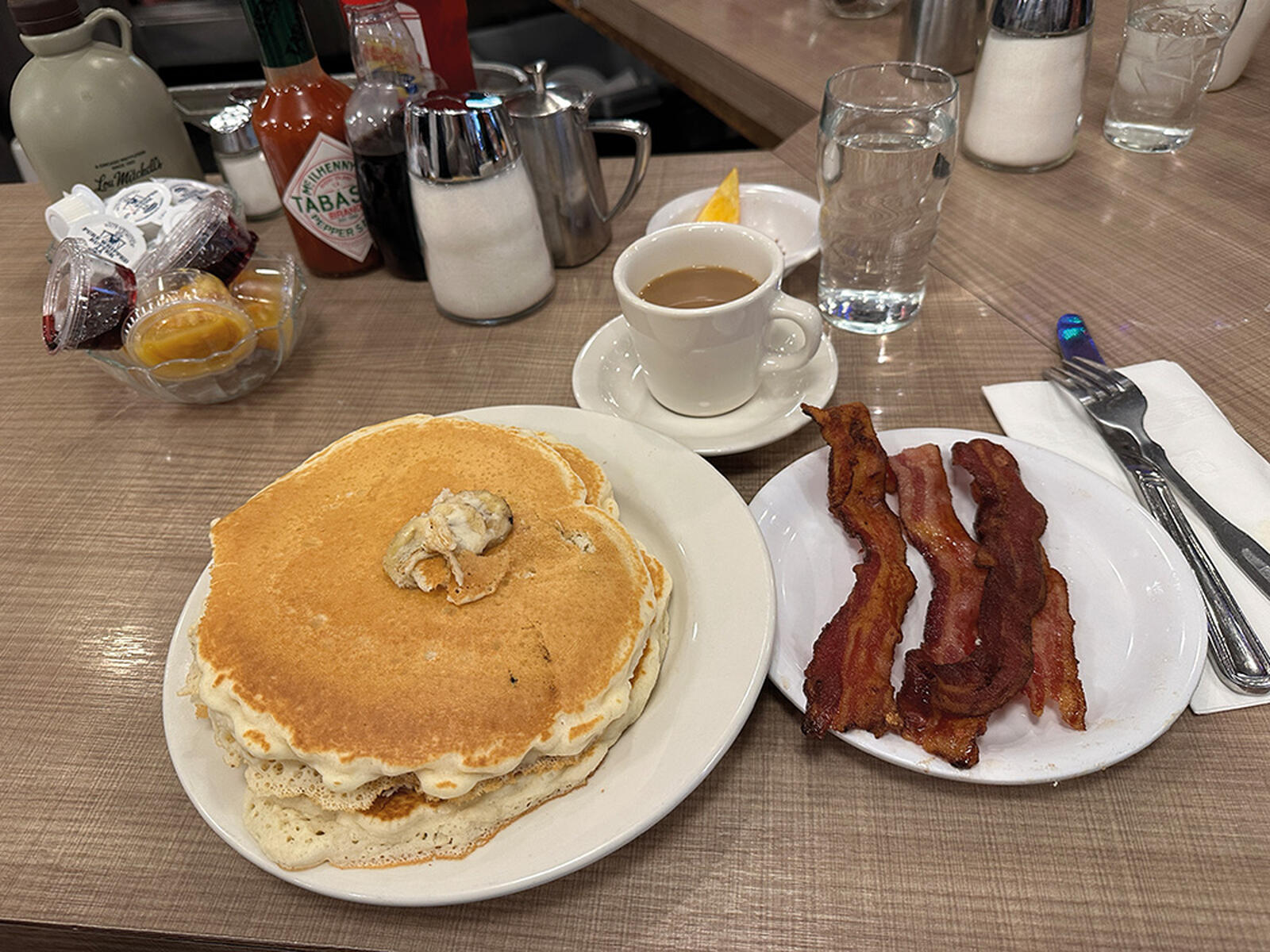 Een dag later geniet ik van een stevig ontbijt in Lou Mitchell’s, een typisch Amerikaanse diner sinds 1923, met ongelimiteerd bijschenken van heerlijke koffie, aangesproken worden met “love” en “honey” en porties waarmee je een heel gezin kan voeden. Mijn “melting pancakes” is een halve pannenkoekentaart. Ik krijg er krokant gebakken spekreepjes bij en als voorafje een krokant beignetje met een sinaasappelpartje. Ik vraag er ook banaan bij, maar ik ben ontgoocheld dat het maar drie schijfjes zijn op de top, tot ik ontdek dat er tussen de pannenkoeken een hele laag banaan ligt. Daar kieper ik nog hun eigen maple syrup bovenop. Uiteraard krijg ik dit niet op.
