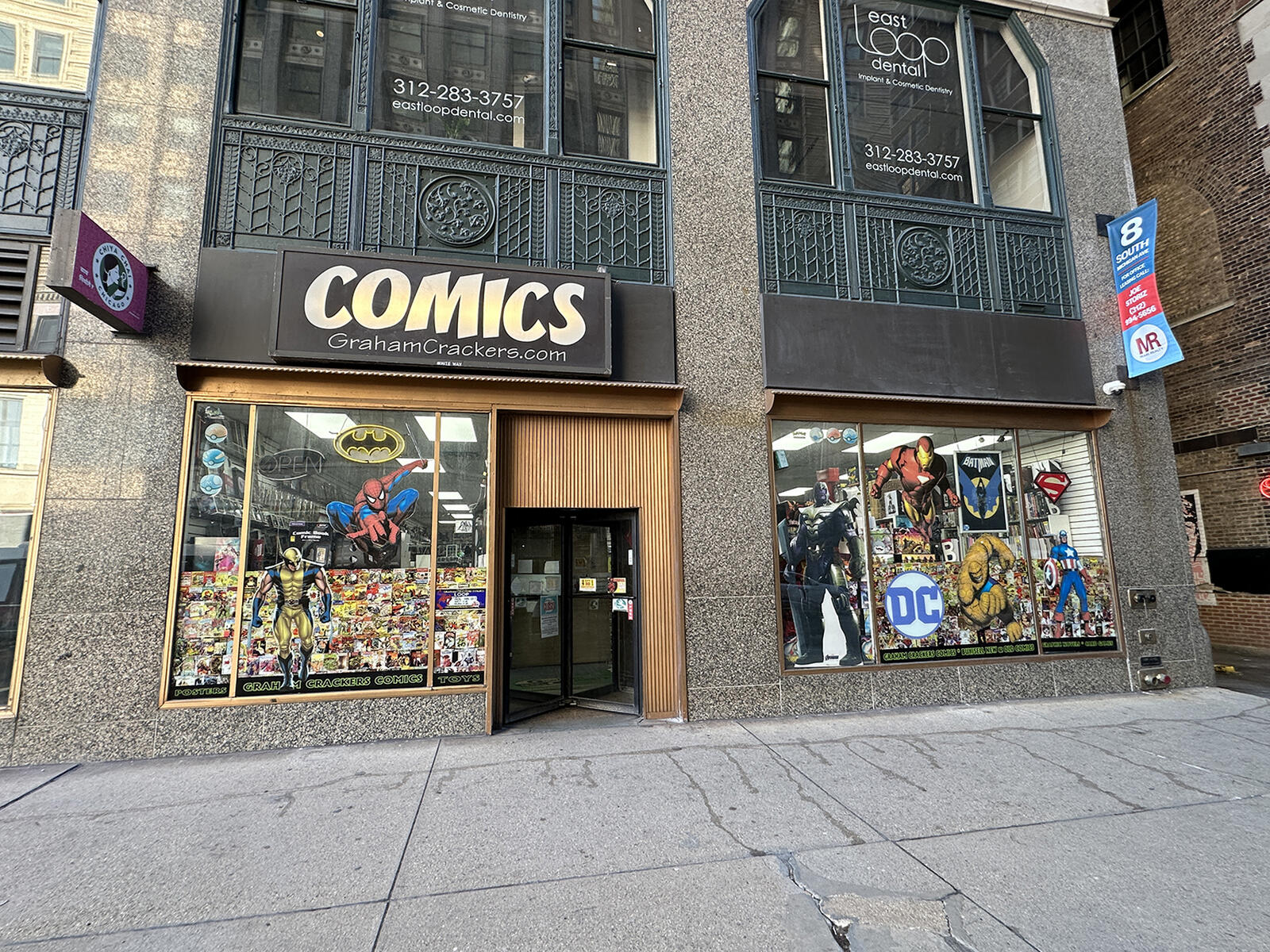 Van de keten Reckless Records is er in Wicker Park ook een vestiging. Het is een wreed toffe platenzaak met bijzonder veel concurrentie van andere platenzaken. En daar kom ik al in de straat van een legendarische filmlocatie. Bij de fake en overdreven gepixelde filmaffiches en uitvergrote platenhoezen vind ik nogal wat stripgerelateerde beelden.