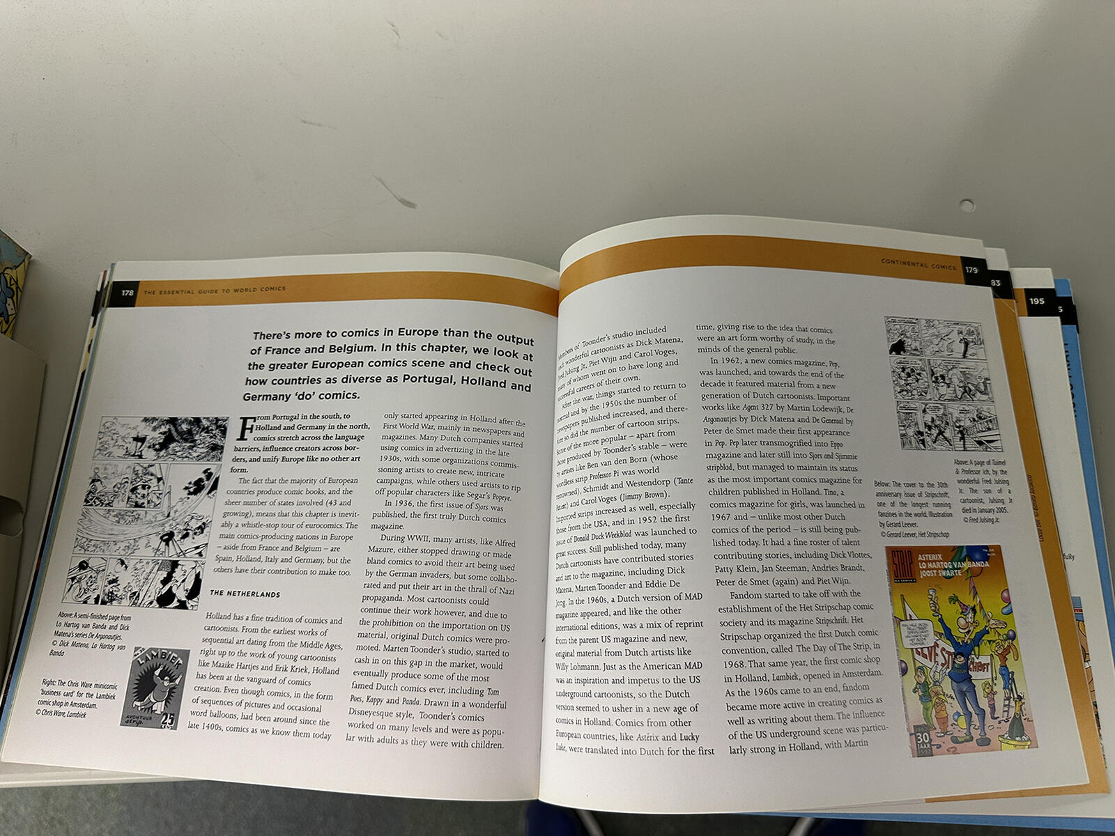 Op de stripafdeling van de bibliotheek loop ik een paar uur langs meterslange kasten vol met strips en naslagwerken over strips. Een ervan is een encyclopedie en daarin staat onder meer Willy Vandersteen vermeld. Het is al een oud boek, want zijn overlijdensjaar 1990 staat er niet in vermeld. Ik blijf maar bladeren door het boek, denk dan aan een volgende naam uit België of Nederland en vergeet daarbij dan welke naam ik in de eerste plaats opzoek. Een Jef Nys staat er bijvoorbeeld niet in, Marc Sleen wel. Geen Don Lawrence of Storm, Marten Toonder en enkele van zijn stripreeksen wel, evenals Hans G. Kresse, een Franquin of Morris en Hergé. Ook in andere geschiedenisboeken over strips die ik doorblader veel van die namen.