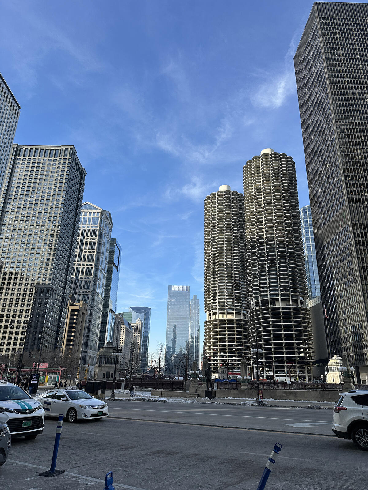 Qua oriëntatie zit ik gebeiteld. Aan de overkant van de Chicagorivier in het centrum The Loop, waar het hotel gevestigd is, staat het bekende Wrigley-gebouw, genoemd naar het kauwgummerk. Op m'n eerste verkenningstochtje lopen we even langs de boardwalk langs de rivier waardoor ik vaak onder een industrieel ogend netwerk van bruggen en wegen wandel. Later kom ik te weten welke filmopnames daar zijn gebeurd. De op hoopjes weggeruimde sneeuw zijn overal blokken ijs geworden.