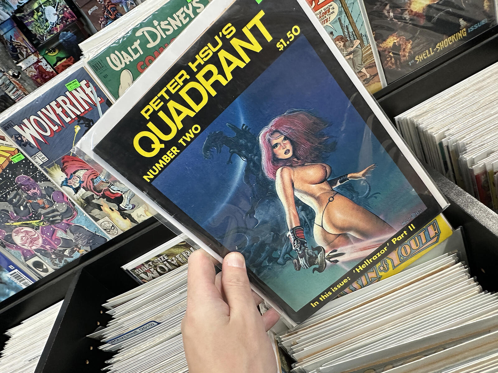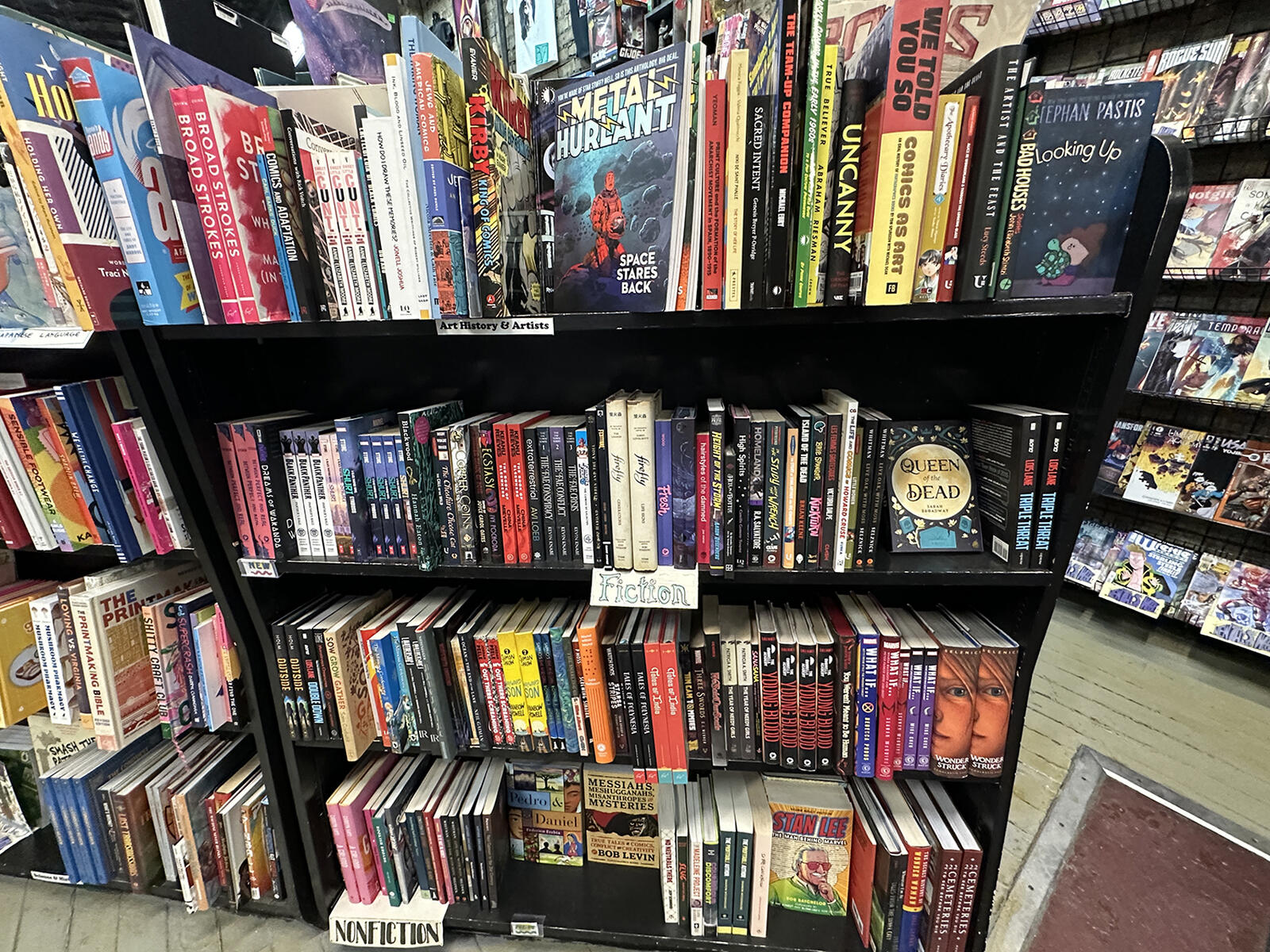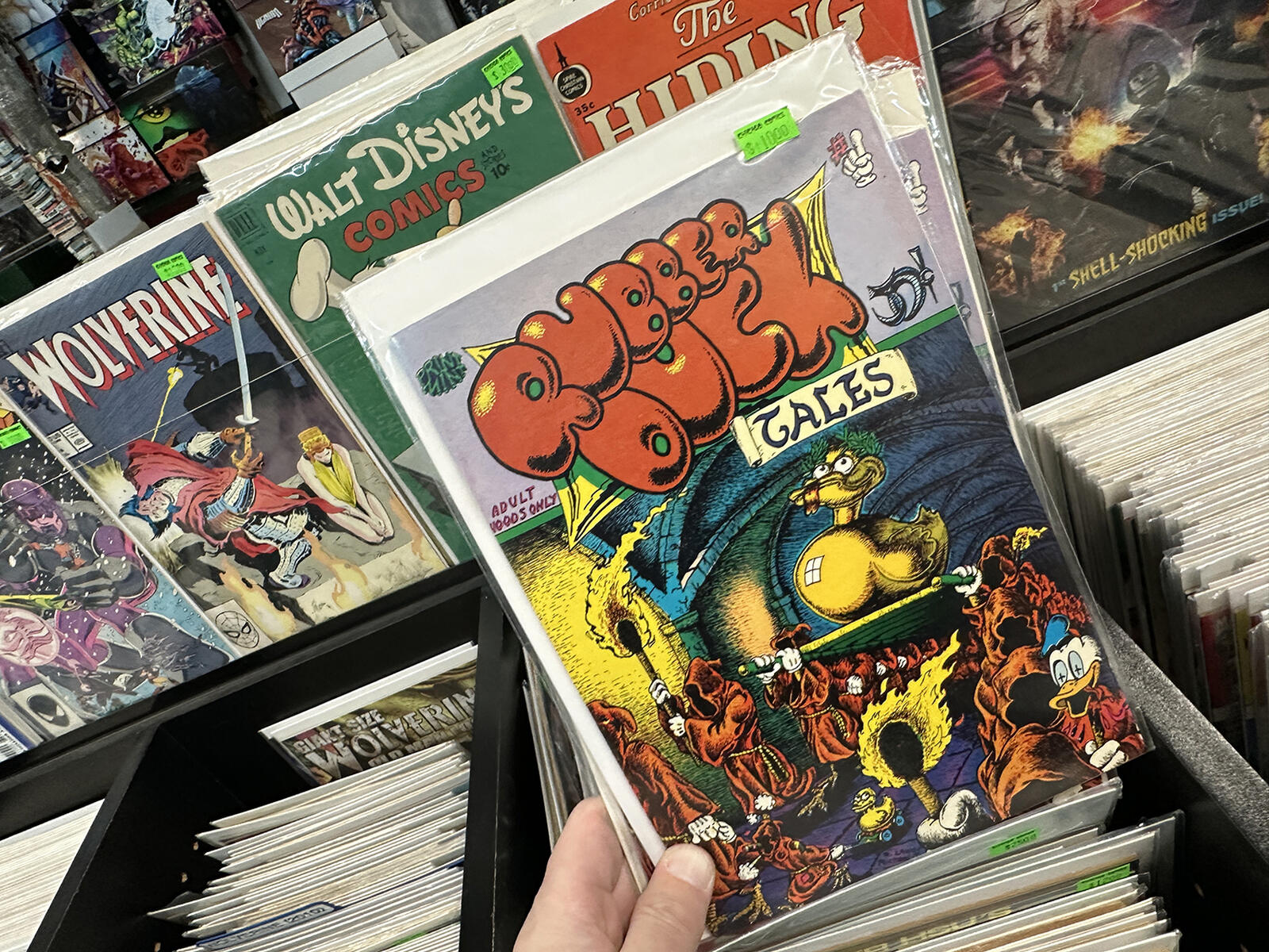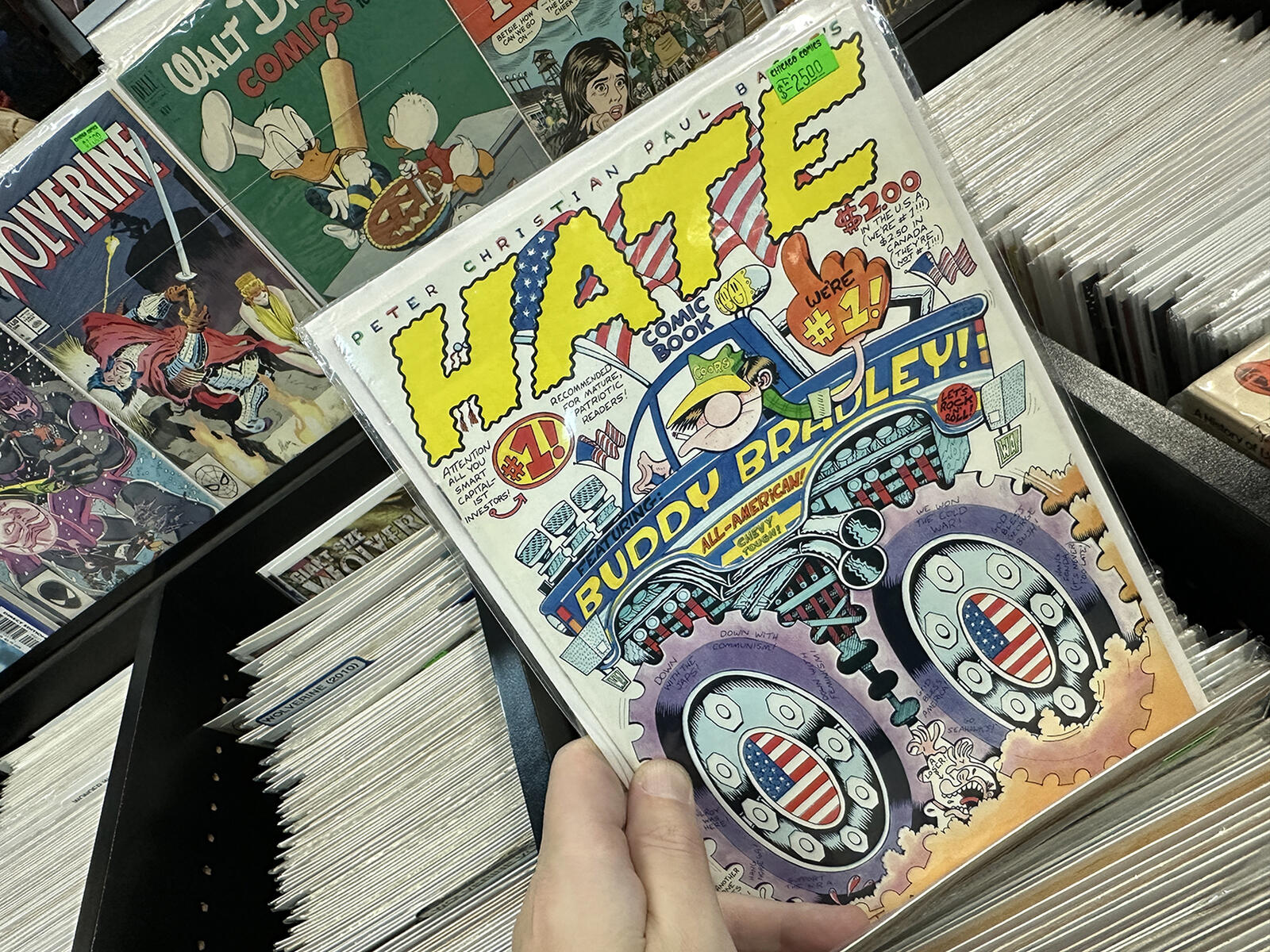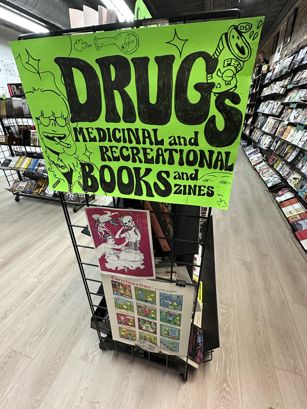 In de plaats koop ik een naslagwerk over Heavy Metal en een anthology met oude stripverhalen uit dat stripblad dat begon met het Franse Métal Hurlant (zie ook deze expo in Brussel). Ik kies ook een oud boek over de geschiedenis van undergroundstrips en een paar van die blaadjes met het werk van Robert Crumb. In de winkel staat ook de vertaling van Zondag van Bruggeling Olivier Schrauwen en de Andy Warhol-biografie van Nederlander Typex. De eigenaar vertelt me dat hij nog in de Amsterdamse stripwinkel Lambiek is geweest dankzij een contact via Chris Ware en er met oprichter Kees Kousemaker heeft gesproken. “Good memories”, mijmerde hij. Hij is zelf een liefhebber van undergroundstrips.