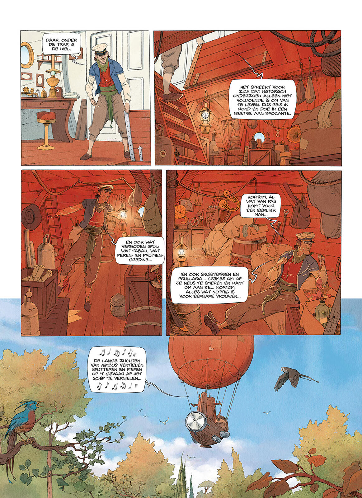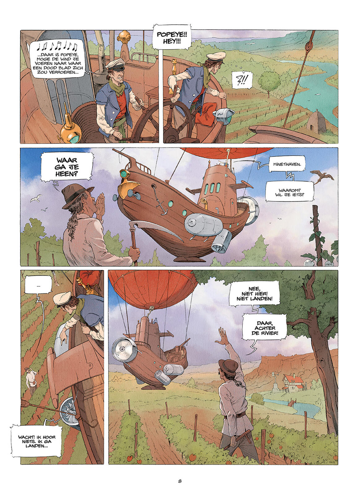 "De Hemelzeiler is een sciencefictionverhaal dat aansluit op Spraag, maar geen vervolg daarop is. Aan boord van zijn vreemde vliegende schip, dat een beetje een handelsschip is en vooral een schip vol nep handelswaar, probeert Popeye zijn rommel te verkopen en misschien wel de planeet en haar bewoners te redden."