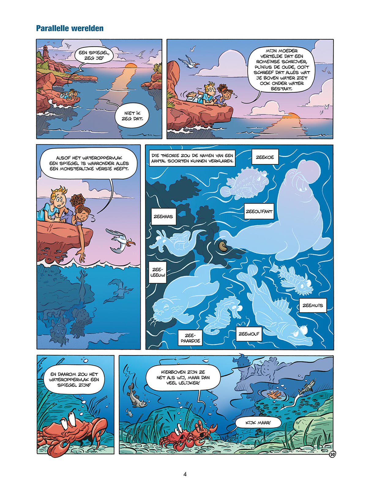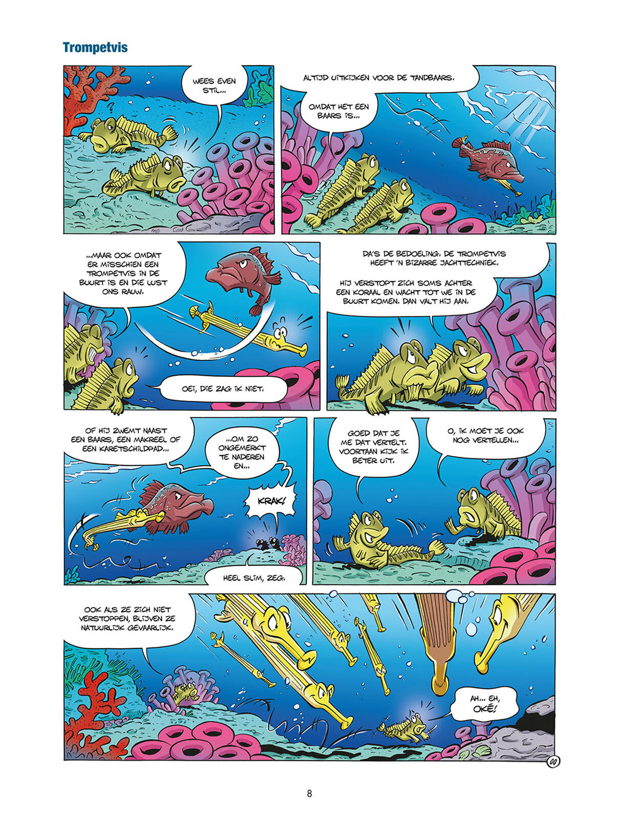 "Haal diep adem en duik in de donkere wateren van de oceanen, op zoek naar de geweldige dieren die er wonen. Van de jachttechnieken van de trompetvis tot de vreemde schelp van de nautilus, langs de doorzichtige wezens uit de diepzee... Je komt echt alles te weten over de zeebodem! Zet je schrap: een duikbril en snorkel zijn aangeraden om deze fascinerende wereld te ontdekken, in het gezelschap van de dieren van Diep in de Zee!"