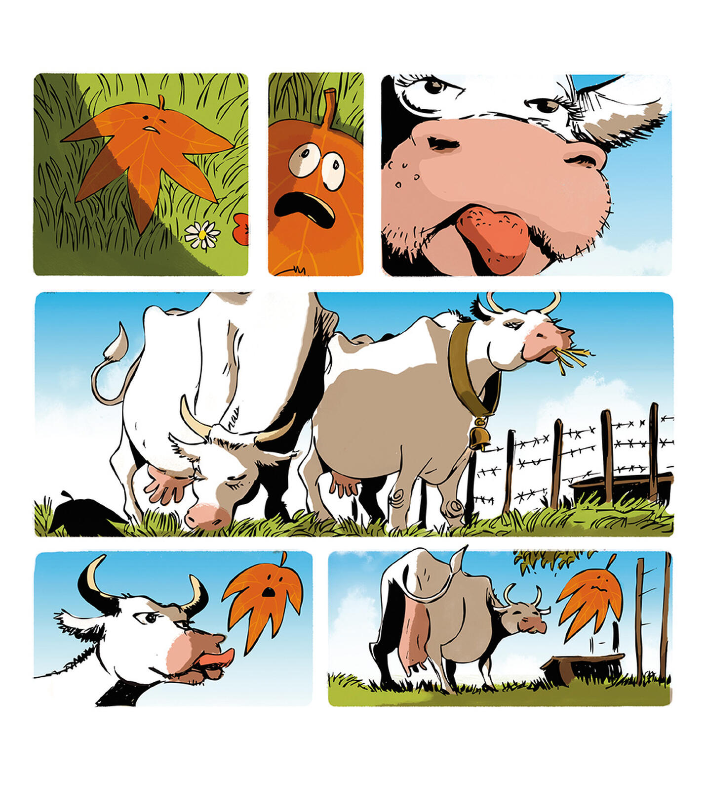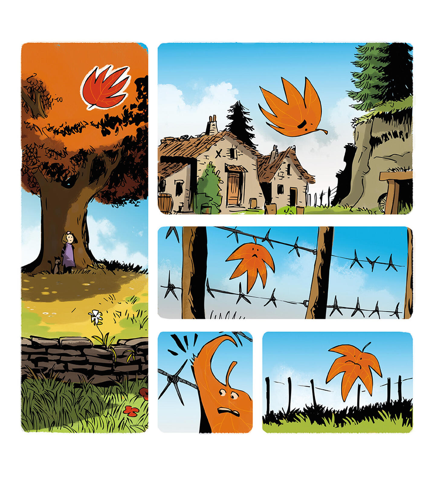 "Aan het einde van de zomer wandelen Liloe en haar kat Friemel door de natuur, die dommelt onder een zacht briesje. Plotseling steekt de herfstwind op en scheidt een stelletje verliefde blaadjes, die samen wiegden aan het uiteinde van hun tak... Zo begint de reis van Folio, een opeenvolging van ontsnappingen en avonturen, waarin spanning, gevaar, humor en tederheid samenkomen."