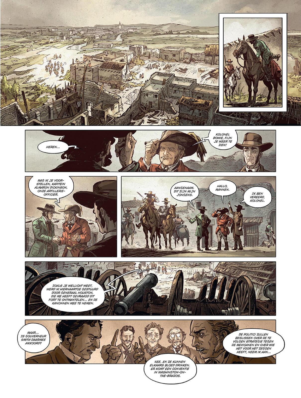 "Mexico, dat sinds 1821 onafhankelijk is, besluit Texas open te stellen voor kolonisatie. Meer dan dertigduizend kolonisten, voornamelijk uit de Verenigde Staten, verhuizen naar dat nieuwe eldorado. Die zogenaamde Anglos trekken zich weinig aan van het Mexicaanse gezag en stilaan broeit er rebellie. Generaal Santa Anna besluit met zijn troepen de opstand neer te slaan. De Texanen verschansen zich in de Alamo, een oude Franciscaanse missie. Onder leiding van luitenant-kolonel William Travis en de avonturier Jim Bowie, verzetten honderdzestig rebellen zich tegen de Mexicaanse troepen. Dertien dagen lang bieden ze weerstand, en 200 jaar later is de gebeurtenis nog steeds in het collectieve geheugen van de Amerikanen gegrift."