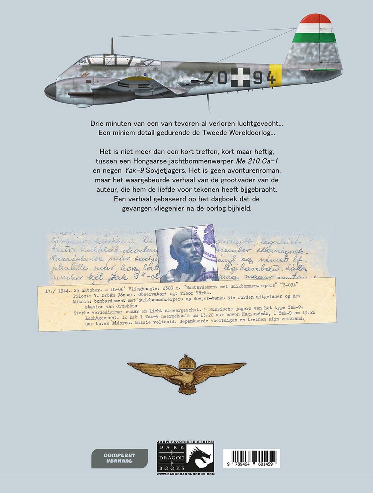 "Drie minuten van een luchtgevecht waarvan de verliezer vast lijkt te staan... Een klein detail tijdens de grote Tweede Wereldoorlog... Het was niets meer dan een kort maar intensief gevecht tussen een Hongaarse Me 210 Ca-1 bommenwerper en negen Sovjet Yak- 9-jagers. Dit is geen avonturenroman, maar het waargebeurde verhaal van de grootvader van de auteur. Hij was degene die hem het verlangen gaf om te tekenen. Een verhaal gebaseerd op het gevangenschapsdagboek dat deze piloot tijdens de oorlog bijhield. Het is ook het verhaal van een al vergeten vliegtuig, waarvan slechts enkele exemplaren geproduceerd zijn."