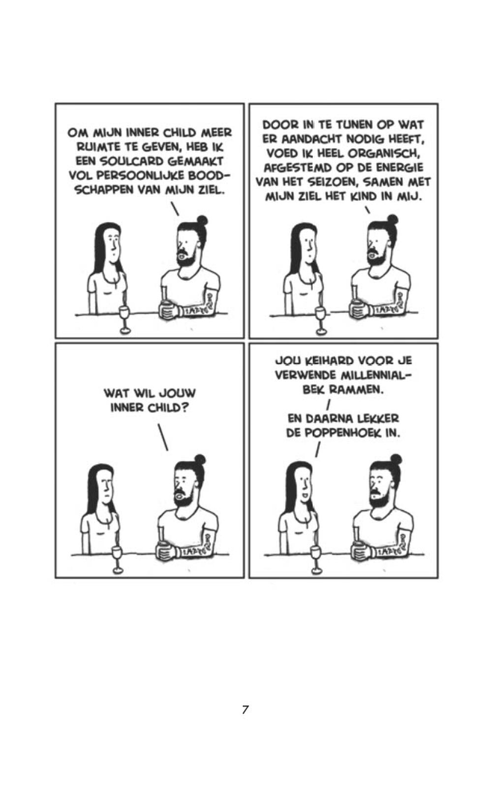 Een van de hoofdrolspelers is de botte, bebrilde, kale manager die uitstraalt dat zijn baan niets voorstelt, maar die wel graag zijn collega’s afblaft en hen de maat neemt. Ook een zuipende kantooryup met het uiterlijk van Mark Rutte en een quinoa etende en lattes drinkende hipster zijn vaste personages, evenals brallende studenten, een afvallige pastoor en bakfietsmoeders. De kantoorhumor beperkt zich niet tot het kantoor, maar speelt zich ook af aan de koffietafel of in de kroeg."