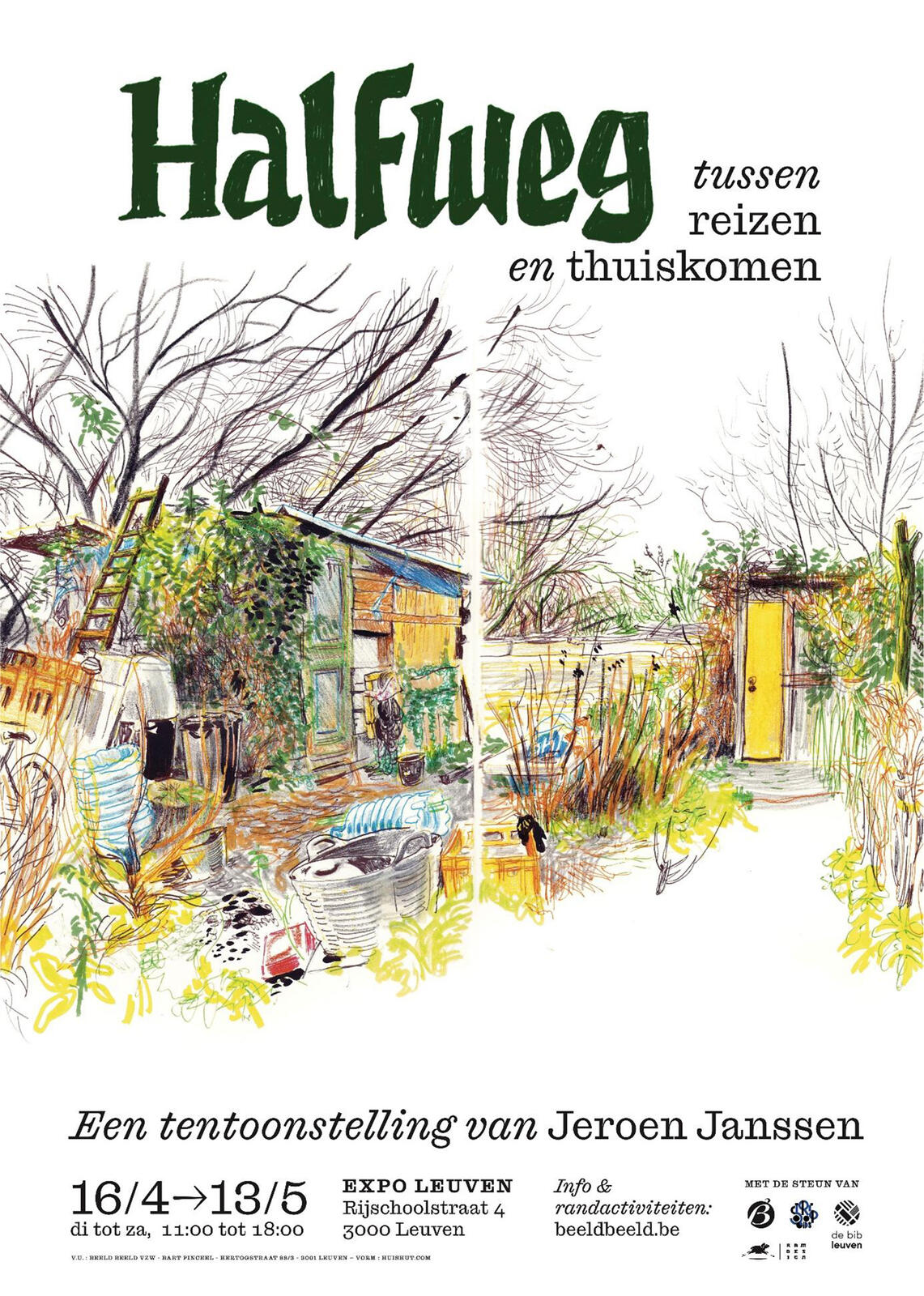 Halfweg wordt als volgt voorgesteld: "Het werk van Jeroen Janssen beweegt onophoudelijk tussen reizen en thuiskomen. Of hij nu de polders van Doel, de heuvels van Rwanda of zijn eigen Ledeberg tekent: zijn blik is altijd tegelijk precies en schetsmatig, intiem en diepmenselijk.
