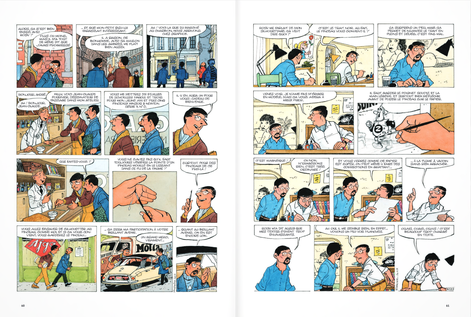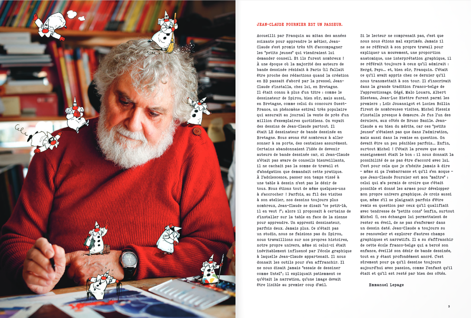 Op de website van Daniel Maghen zijn heel wat previewpagina's te bekijken. Het hoofdstukje met Fourniers ontmoeting met Franquin, wat deze laatste voor de toen jonge Bretoen heeft betekend en de tips die hij van hem heeft gekregen, delen we hieronder met je onder het voorwoord van Emmanuel Lepage, een van de tekenaars die op hun beurt les hebben gekregen van Fournier.