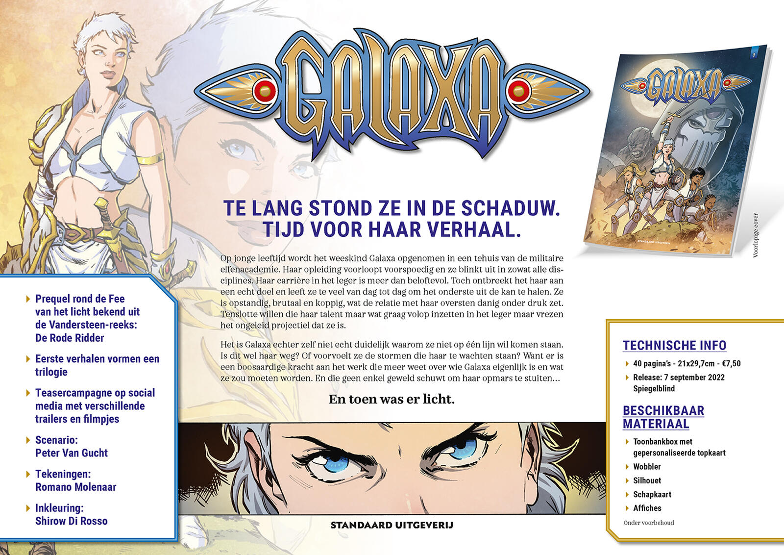 Tekenaar Romano Molenaar, scenarist Peter Van Gucht en inkleurder Shirow Di Rosso zijn de creatieve krachten achter de nieuwe reeks Galaxa. Het eerste deel verschijnt in september, deel 2 wordt eind dit jaar verwacht en het afsluitende album van de cyclus is voor begin 2023 gereserveerd. Bij succes wordt de reeks verlengd en vanaf dan legt het team zich toe op complete verhalen per album.