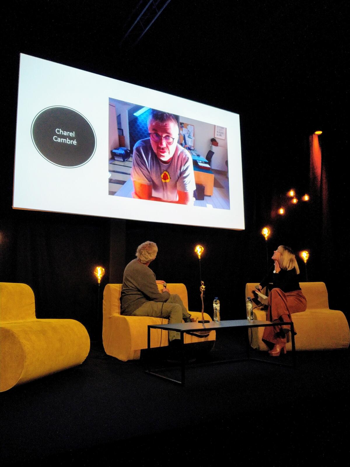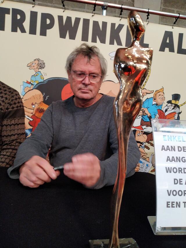 Hij had het ook over albums waaraan hij bezig is. En dat zijn er niet weinig. Er zijn de vaste reeksen, zoals De Rode Ridder en De Kronieken van Amoras, maar nog heel wat meer projecten. De nieuwe Piet Pienter en Bert Bibber bijvoorbeeld. De erfgenamen van tekenaar Pom hadden eerder aarzelend toegestemd om een nieuw album in de reeks van wijlen hun vader uit te brengen. En ze stelden als voorwaarde dat het bij één album zou blijven, ongeacht het eventuele succes. Er waren ook twee video’s te bekijken van collega’s die hem gelukwensen: Marcel Rouffa en de nochtans in de zaal aanwezige Charel Cambré, die de show stal door voor te stellen het gewonnen beeldje beurtelings bij hem thuis én bij Marc Legendre tentoon te stellen.
