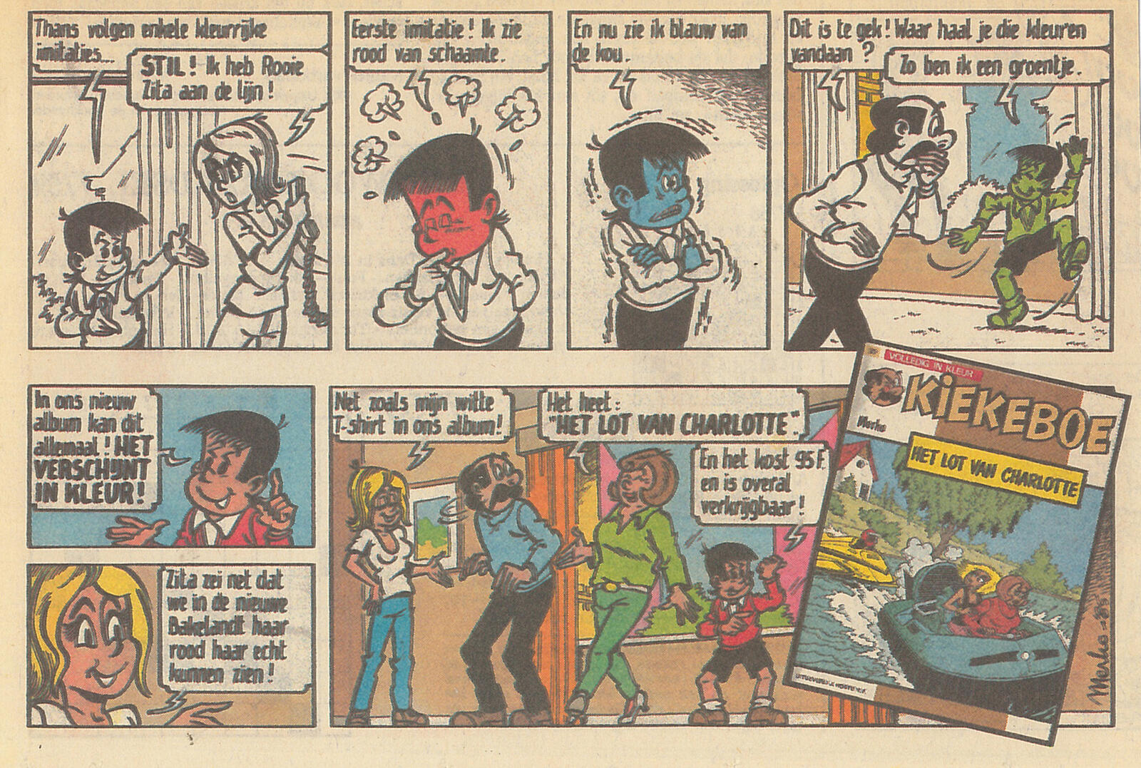 Beelden hieronder: Krantenadvertentie uit 1985 als promotie voor het allereerste album in kleur van Kiekeboe. Merho en Hec Leemans in 1990 en een gezamenlijke tekening van de twee stripmakers om de verhuis van uitgeverij J. Hoste naar Standaard Uitgeverij kenbaar te maken. Deze illustratie staat in 1990 op de persmappen van het Bakelandt-album Blanke Slavinnen (deel 47) en het Kiekeboe-album Konstantinopel in Istanboel (deel 46).
