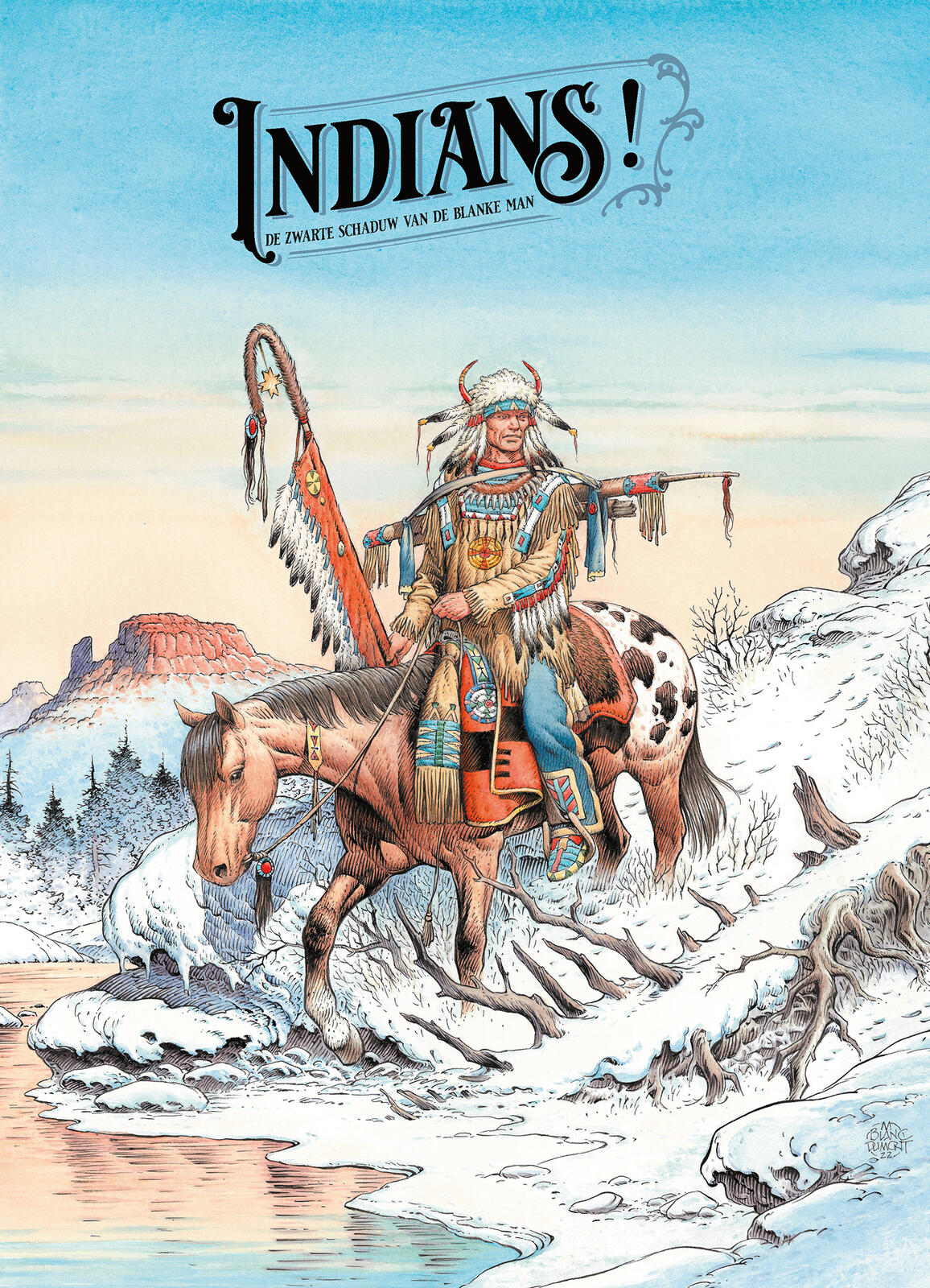 Met de ondertitel De Zwarte Schaduw van de Blanke Man bundelt het album Indians! zestien korte verhalen die de genocide op de oorspronkelijke Amerikaanse bevolking vertellen aan de hand van de verovering van het Wilde Westen. Go West Young Man, de voorloper van deze ensemblestrip, was ook al geen vrolijke western. Deze verhalen verschenen in voorpublicatie in Eppo. Saga Uitgaven publiceert Indians! in drie versies, elk met een andere cover: softcover met covertekening van Michel Blanc-Dumont (te verschijnen in november), hardcover met covertekening van Mathieu Lauffray (nieuw in oktober) en een luxe op groot formaat (ook in oktober) met covertekening van Paul Gastine, ex libris en 8 bonuspagina's met voorstudies, schetsen en alle drie coverillustraties.