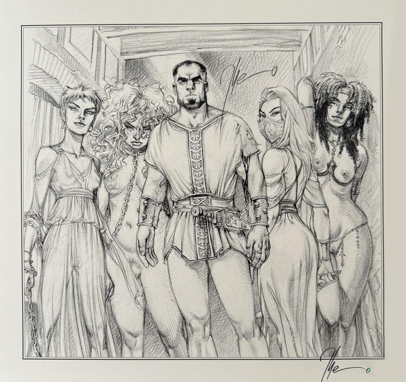 Dufaux over de prequel in Casemate: "We ontmoeten er een van de gladiatoren uit de reeks in de Maghreb (het noordwestelijke deel van Afrika, nvdr), terwijl de Romeinse legioenen daar op enige weerstand stuiten. In Murena bevinden we ons de hele tijd in Rome, met uitzondering van een kort verblijf in Gallië. Het is interessant om te zien hoe deze macht zich over de toenmalige bekende wereld heeft verspreid." Scènes uit het tweeluik spelen zich ook af in een bordeel. En daar tekende Theo al eens een ex ibris van voor een signeerfestival. Een foto ervan opent dit artikel.