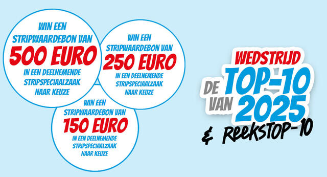 Voor al wie ons dus twee top-10'en stuurt (jouw top-10 van 2025 én jouw reekstop-10 aller tijden), maakt kans op een van de drie waardebonnen die we uitreiken aan de deelnemers. Eén winnaar krijgt een waardebon van 500 euro, de tweede winnaar krijgt er een van 250 euro en tot slot is er een derde winnaar die 150 euro mag spenderen in een stripspeciaalzaak naar keuze uit deze lijst.